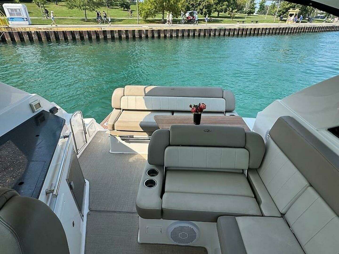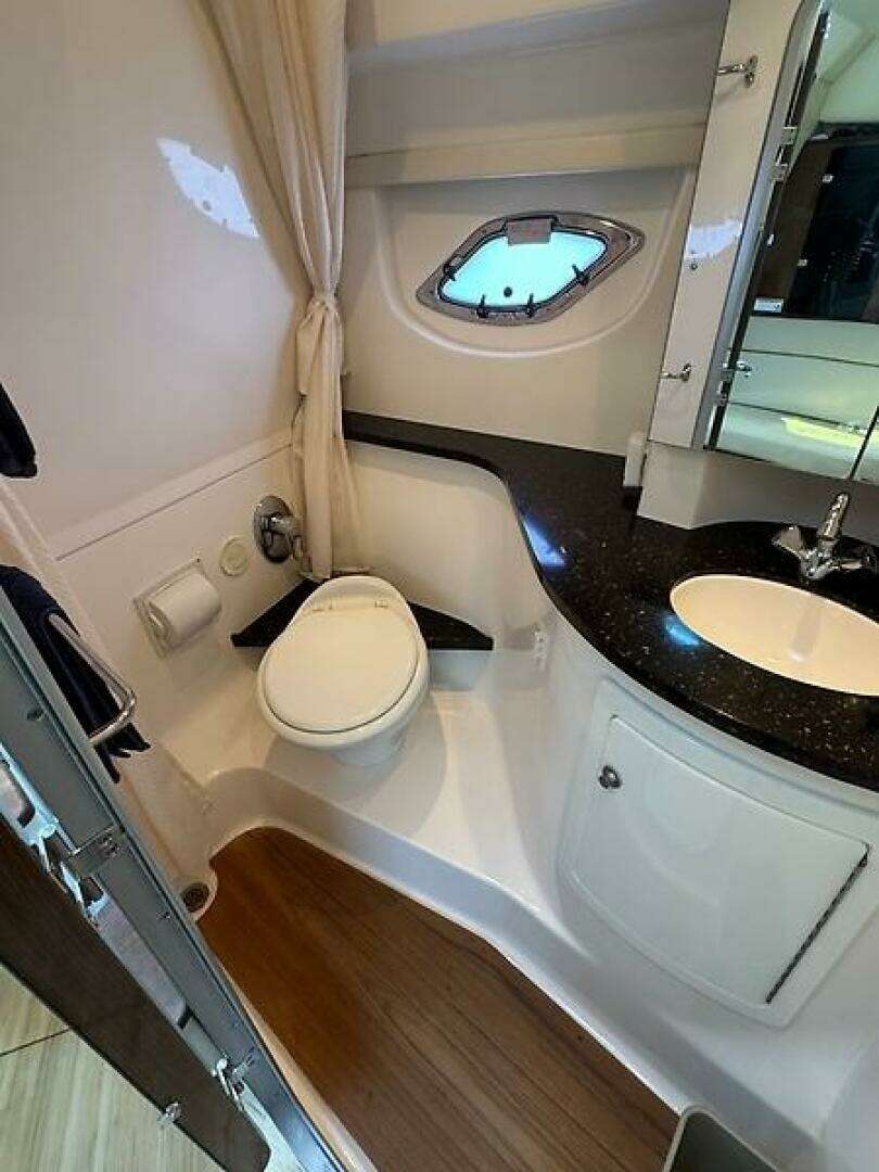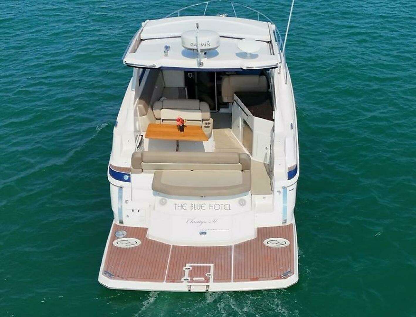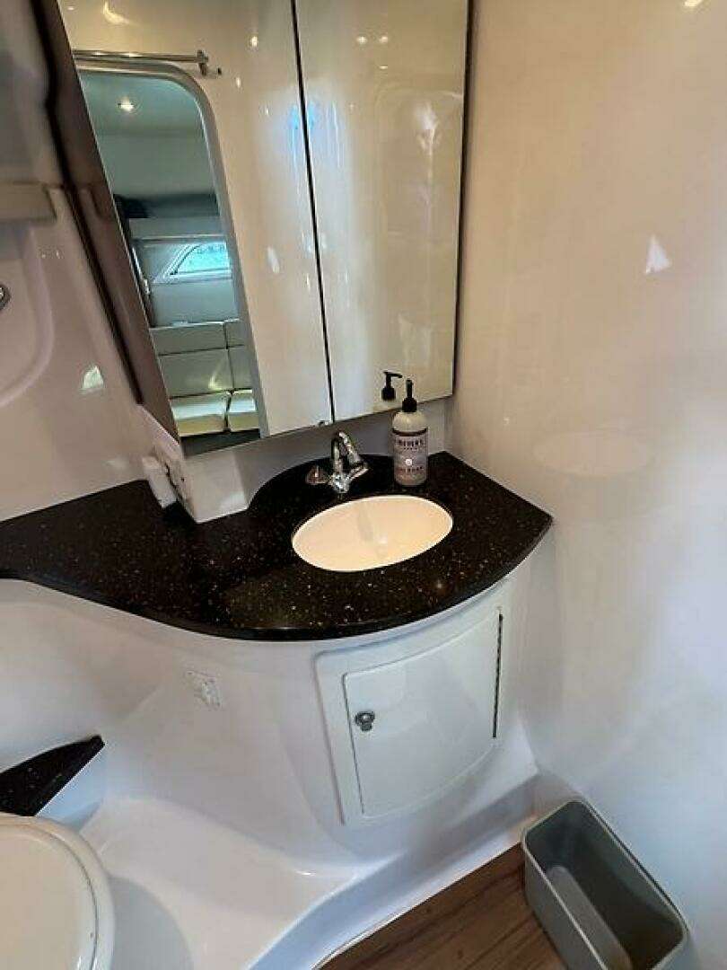| Notable Upgrades: Highlights & Features Freshwater use only Air conditioning at both helm & cabin Brand-new Smart TV in cockpit + two TVs in cabin Underwater lights Bluetooth sound system 2023 New navigation lights Garmin Reactor autopilot Custom seagrass snap-in flooring New bilge pumps New horn New spark plugs Two new batteries Upgraded metal belt for retractable sunroof 2024 Swim platform enhancement (re-caulk & added reinforcements) Trim tabs serviced Oil change New impellers for drives New bottom paint New senders for stern drives New trim cylinders 2025 New sand and bottom paint Swim platform repainted & fiberglass work completed Drives serviced New sump pump New fuel pump for generator New water pumps for water-cooled system |