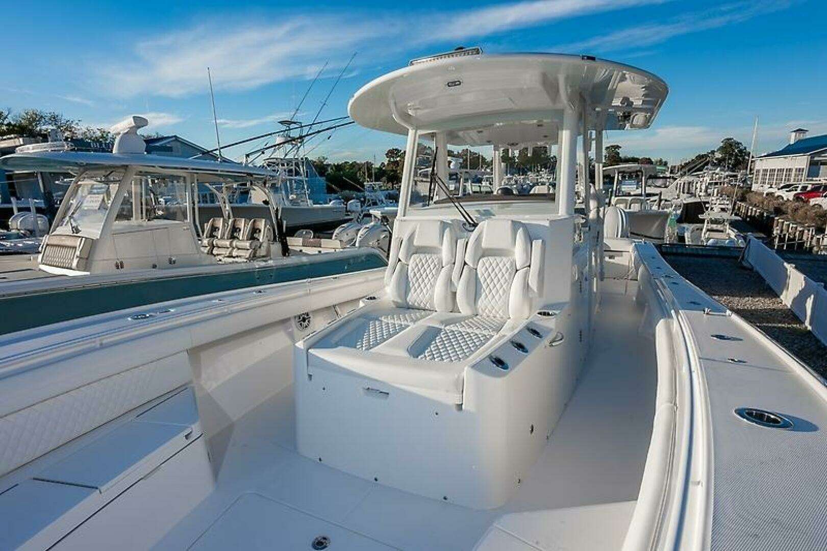 High Tech Systems, In-Deck Fishboxes, Oval Pressurized Center Livewell, Triple Helm with Center Set Steering Wheel & Mezz Seat, up to 49 rod holders, and the option for Standard Split Forward Seating or optional Wraparound Forward Seating answer the call of anglers and boaters who want it all.