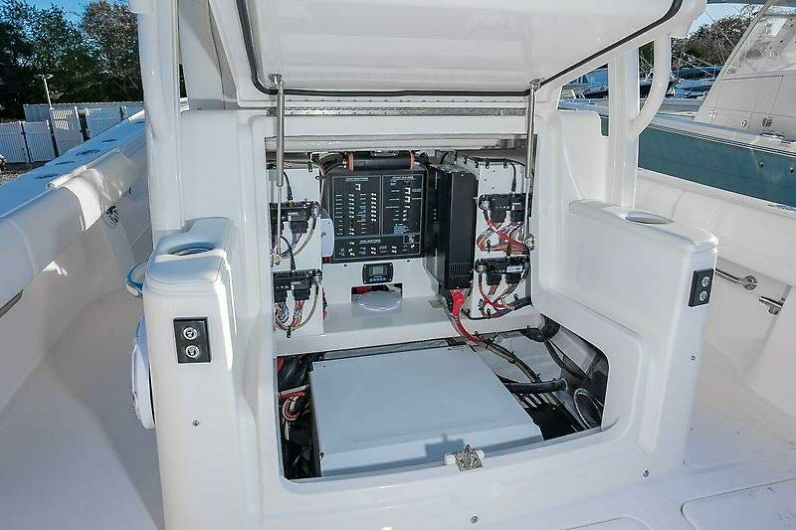 - Illuminated Machine Room beneath Mezzanine Seat with Watertight Bulkhead, Optional Gyro, and Easy Access to Breaker Panel, Fuel and Water Tanks, and Battery Systems