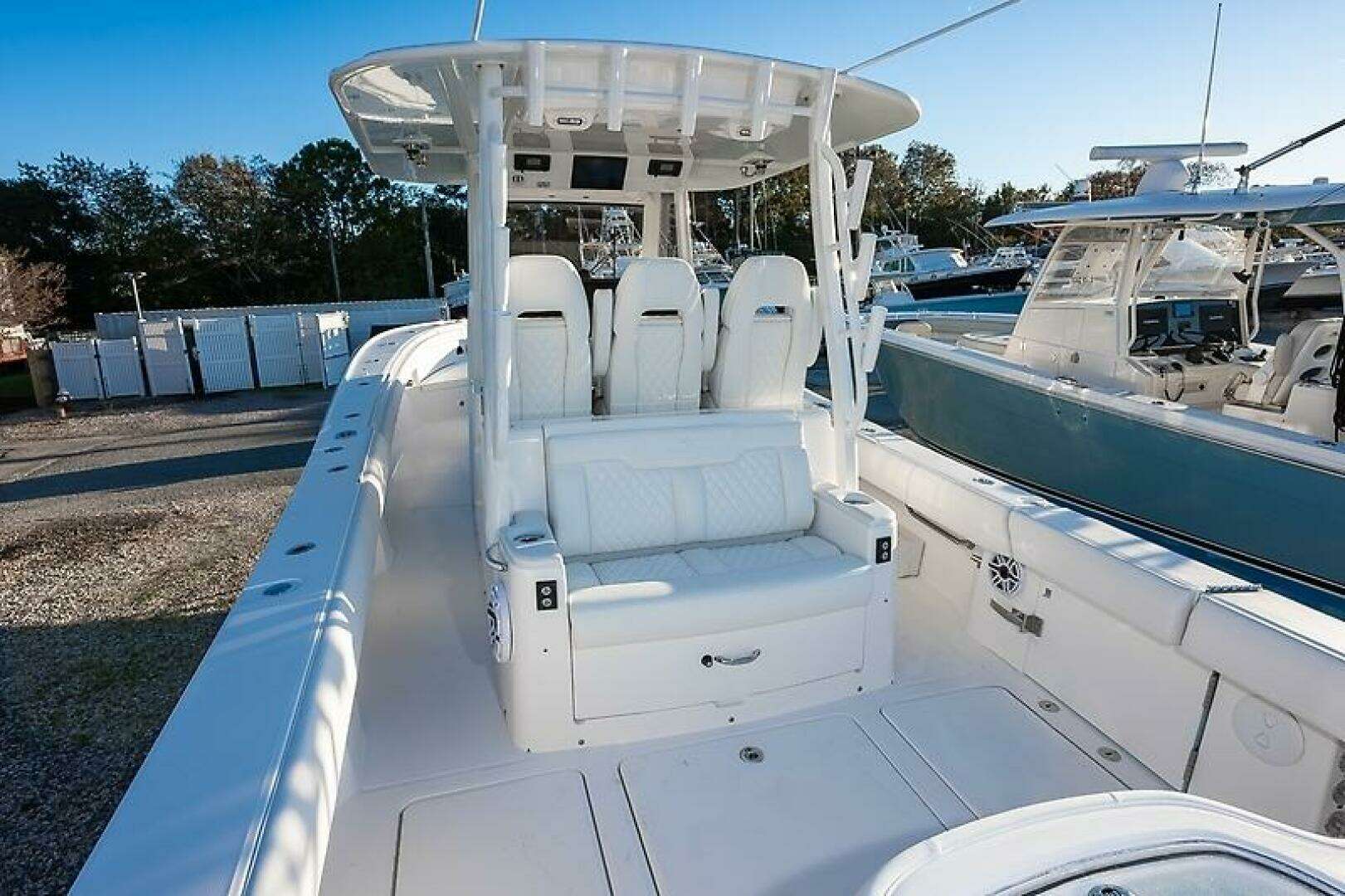 - Triple White Yamaha Offshore F350 4-Stroke Engines with DES Tilt Helm, DEC, EX Autopilot with Waypoint Deceleration, and Electronic Key Switch with Wireless Fob