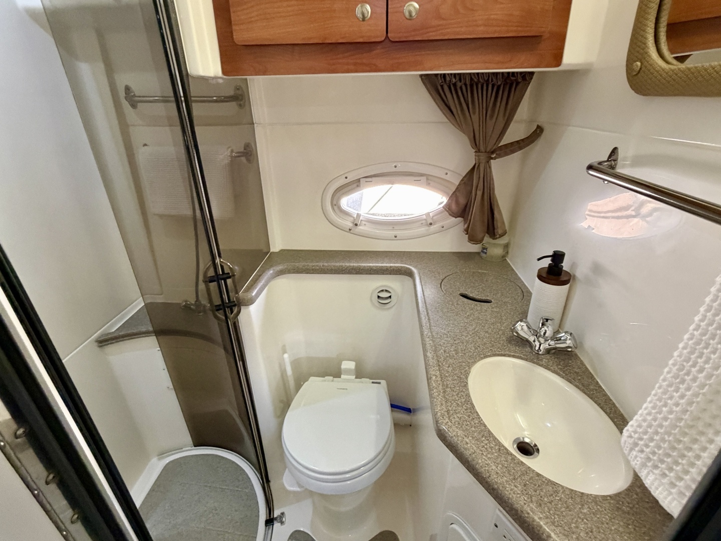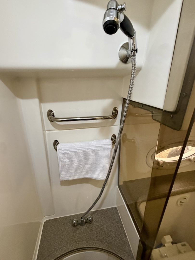 To port and aft of the galley you'll find the roomy head compartment complete with a separate shower stall, vaccuflush head, vanity sink, mirror, and integrated cabinet storage.