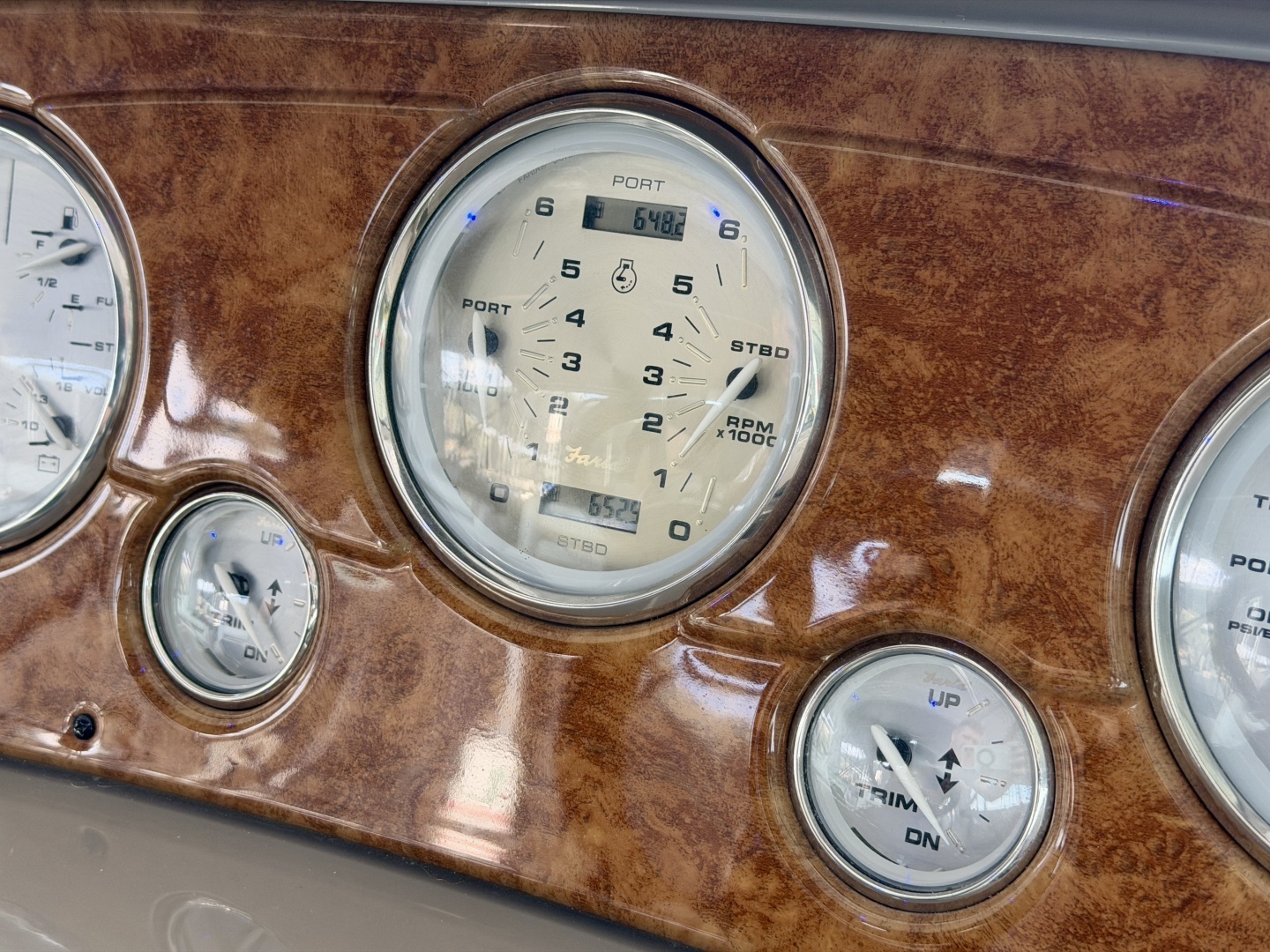 Dual Tachometers w/Digital Engine Hours, Dual Cluster (Port & Starboard) w/Engine Temp. & Oil Pressure, Engine Synchronizer, & Analog Clock, (2)12Volt Outlets, Hydraulic Trim Tabs w/Indicator Gauge,