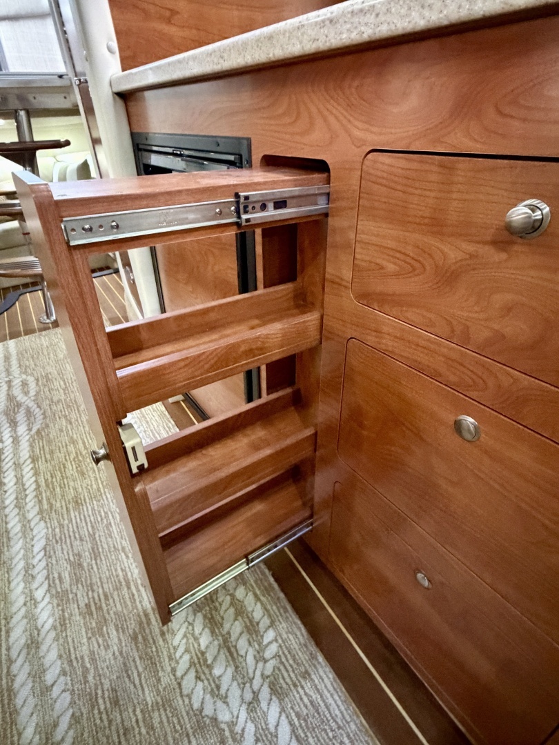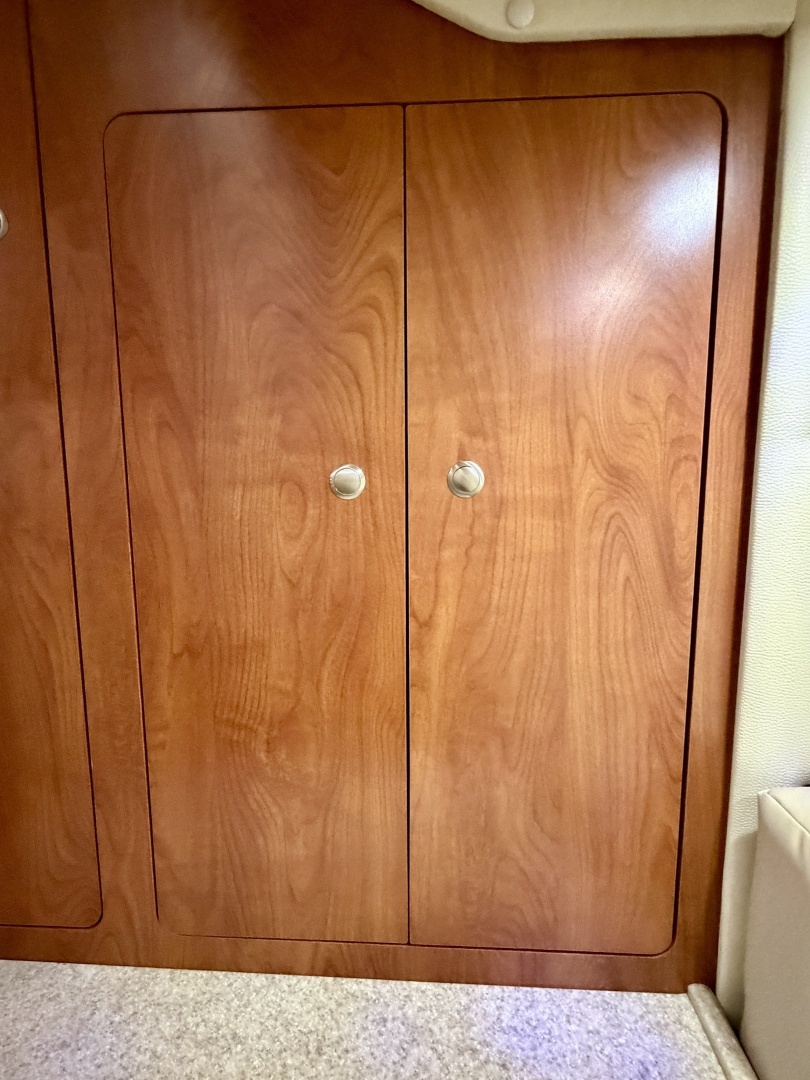 All the way aft you'll find the mid-cabin lounge that is furnished with a second removable table that can be stored away when converting the space to a third berth for additional sleeping space. A privacy curtain is available when needed. A 19'' LED TV w/DVD player is mounted to the starboard wall of the mid-cabin and additional storage is also available to the starboard side that houses a pair of GFCI outlets, 2x 12Volt outlets, a central vacuum system, a hanging closet, and the breaker panels for both your AC and DC power, the head unit for the stereo, CD Changer, Amplifier, and more.