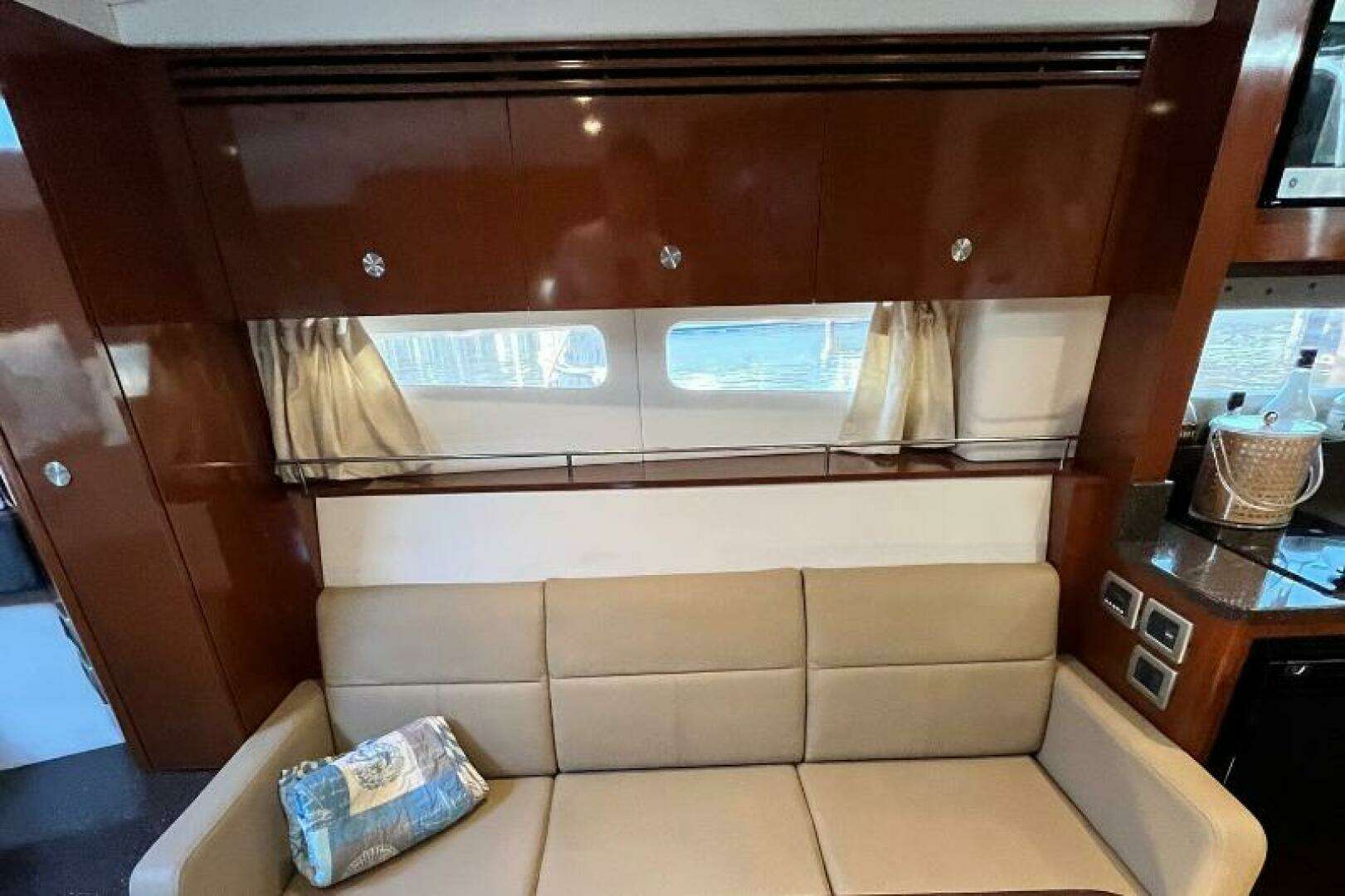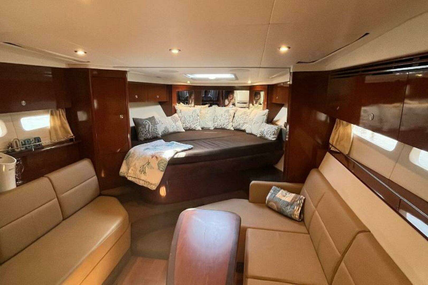 Perfect for both laid-back and large-scale cruising, the 350 Sundancer has a social Cockpit that converts to a sun pad, and a raised Helm with double bench seat and advanced electronics. First-class amenities in the Cabin start with the island-style bed and gorgeous Salon. An enclosed Stateroom is available in lieu of the mid-berth. Choose your power from gas or diesel stern drives, or gas inboards.