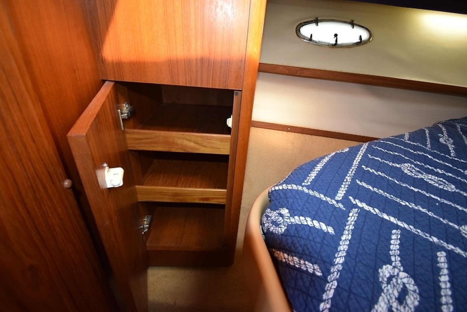 hardly revolutionary in concept, she’s a beautifully crafted express cruiser whose classic styling has held up well over the years. Built on a modified-V hull with a wide 13'3" beam, prop pockets reduce draft and shaft angles. Primarily a cruising boat, the large cockpit of the 3500 Open provides an excellent platform for fishing as well. A transom door, wet bar, and in-deck fish box are standard, and the entire bridge deck rises on hydraulic rams for access to the motors. Belowdecks, the spacious single-stateroom interior of the 3500 Open can only be described as lush, with handcrafted teak joinery, leather upholstery, and a full teak-and-holly cabin sole. Additional features include an L-shaped lounge opposite the helm, aft-facing cockpit seats, an electric windshield vent, an integral swim platform, and a bow pulpit. The optional 370hp Cummins diesels cruise at 25–26 knots and reach a top speed of around 30 knots.