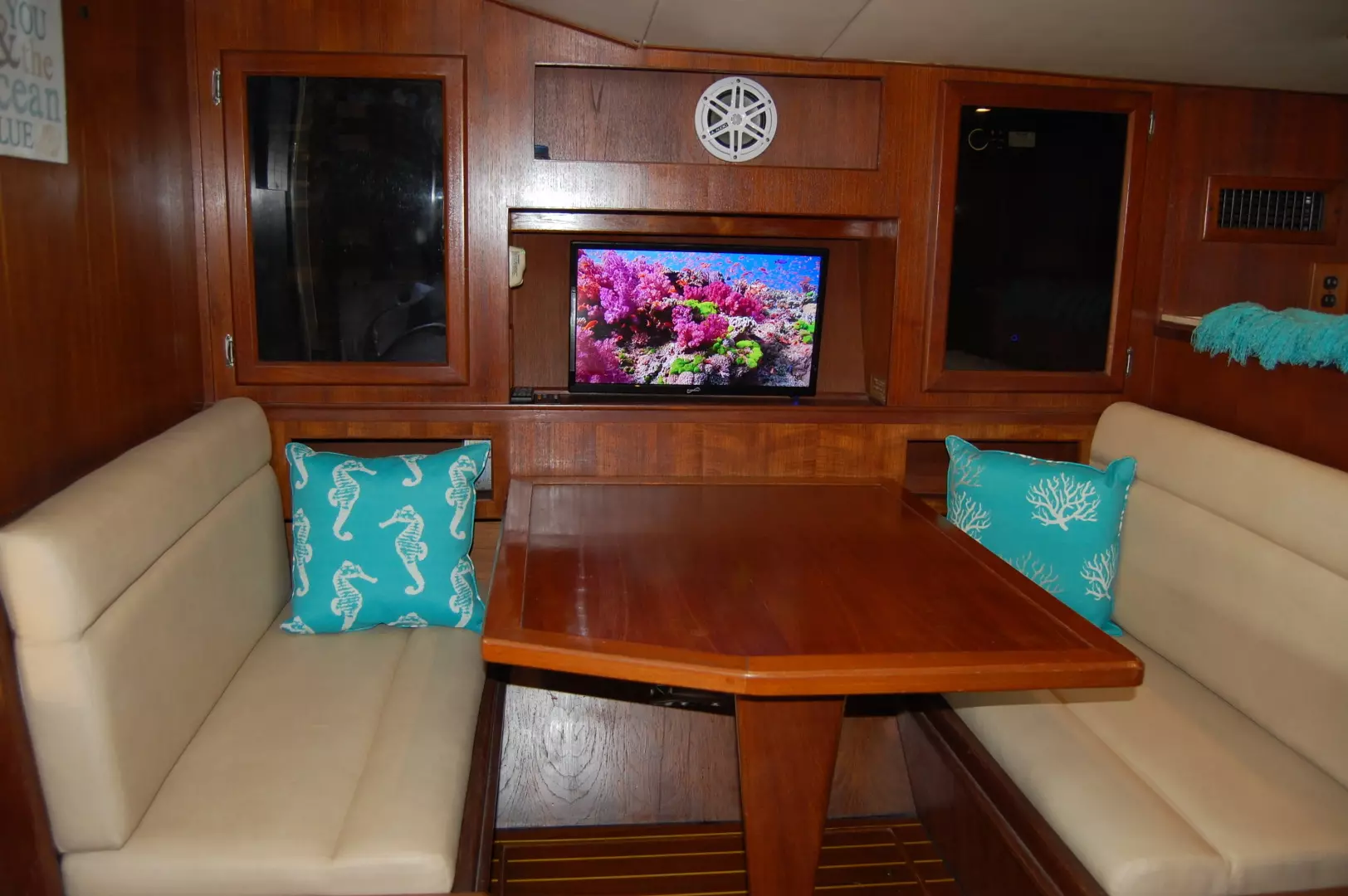 screen. Beautiful Teak cabinetry with teak & Holly cabin floor.
