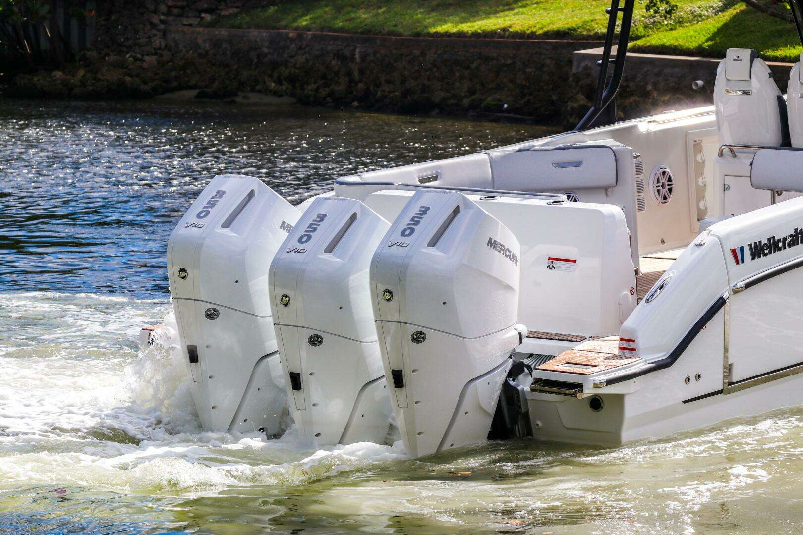 Powering this impressive boat are three Mercury 350 CXL CF outboard engines, delivering a robust total of 1,050 horsepower, ensuring thrilling acceleration and top-notch handling. The Wellcraft 38 T-Top is equipped with modern features, including advanced joystick control for effortless maneuverability.