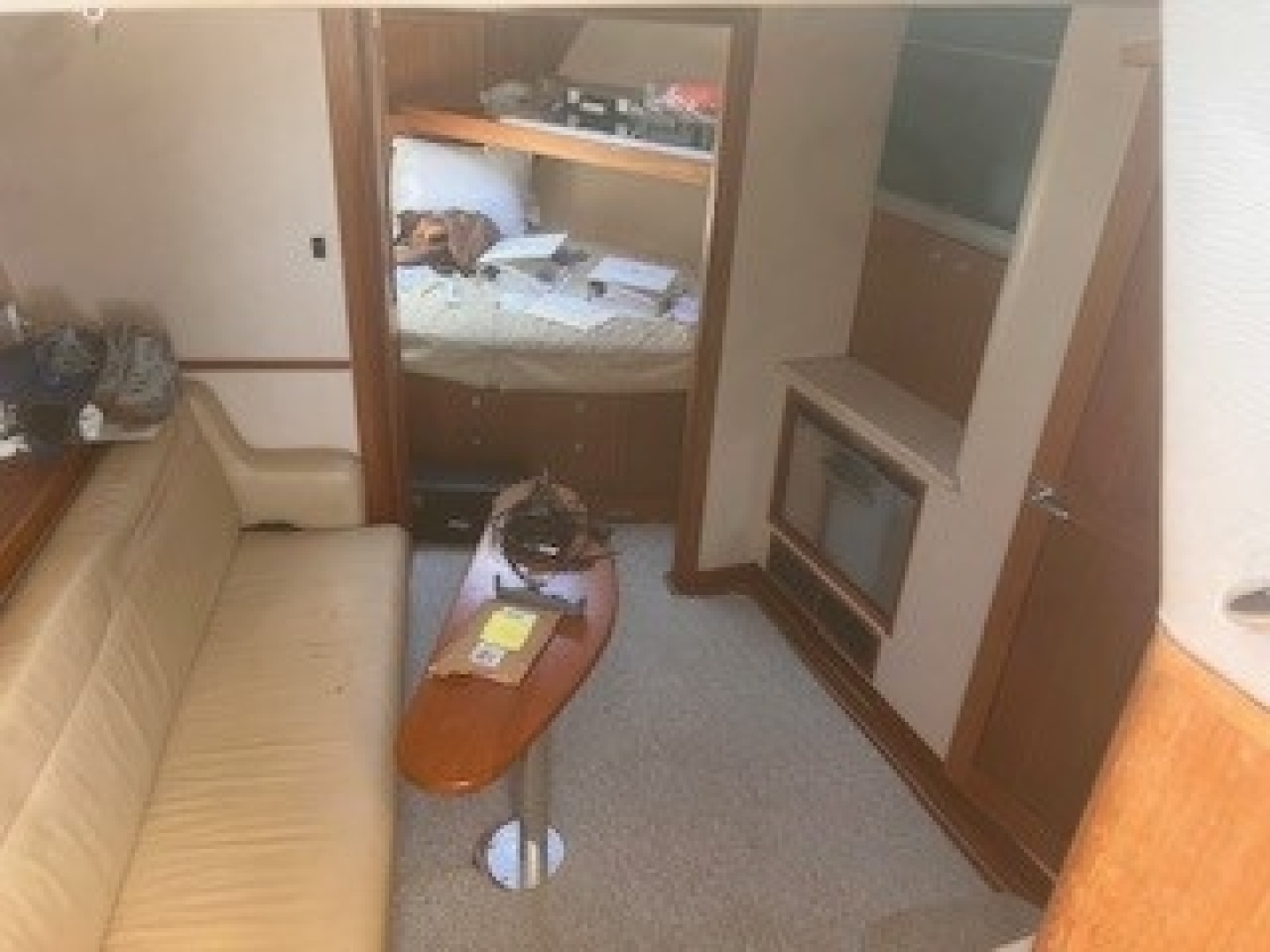 The spacious lay out on deck offers excellent visibility and features wrap-around bench seating with coaming pads for added comfort. BLUE PURSUIT’s cockpit is fully equipped with an in-transom fish box, livewell, bait freezer, prep sink, and tackle drawers - everything right where you need it – the perfect set up for that avid angler. Below deck, she’s thoughtfully laid out with a spacious teak interior and a well-equipped galley featuring a microwave and Corian countertops. She comfortably sleeps five, with a convertible settee and a private forward cabin offering an offset double berth with a single berth above. An enclosed head with a separate shower completes the space - ideal for overnights or extended trips.