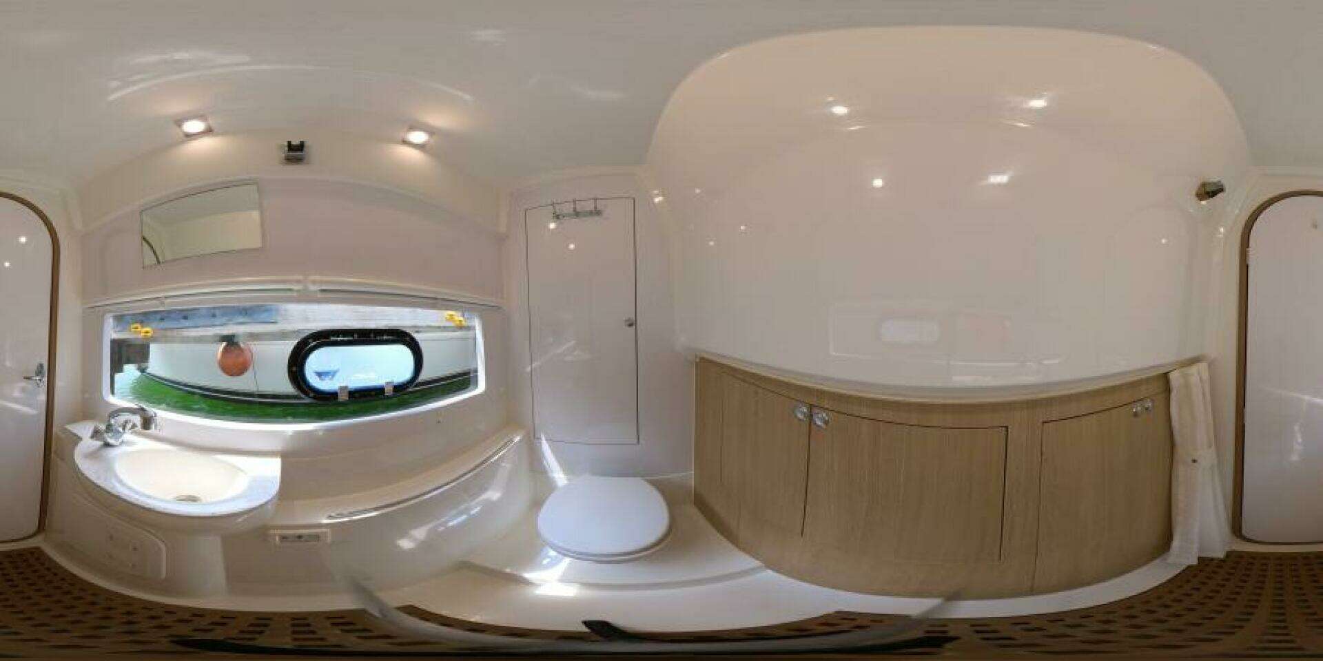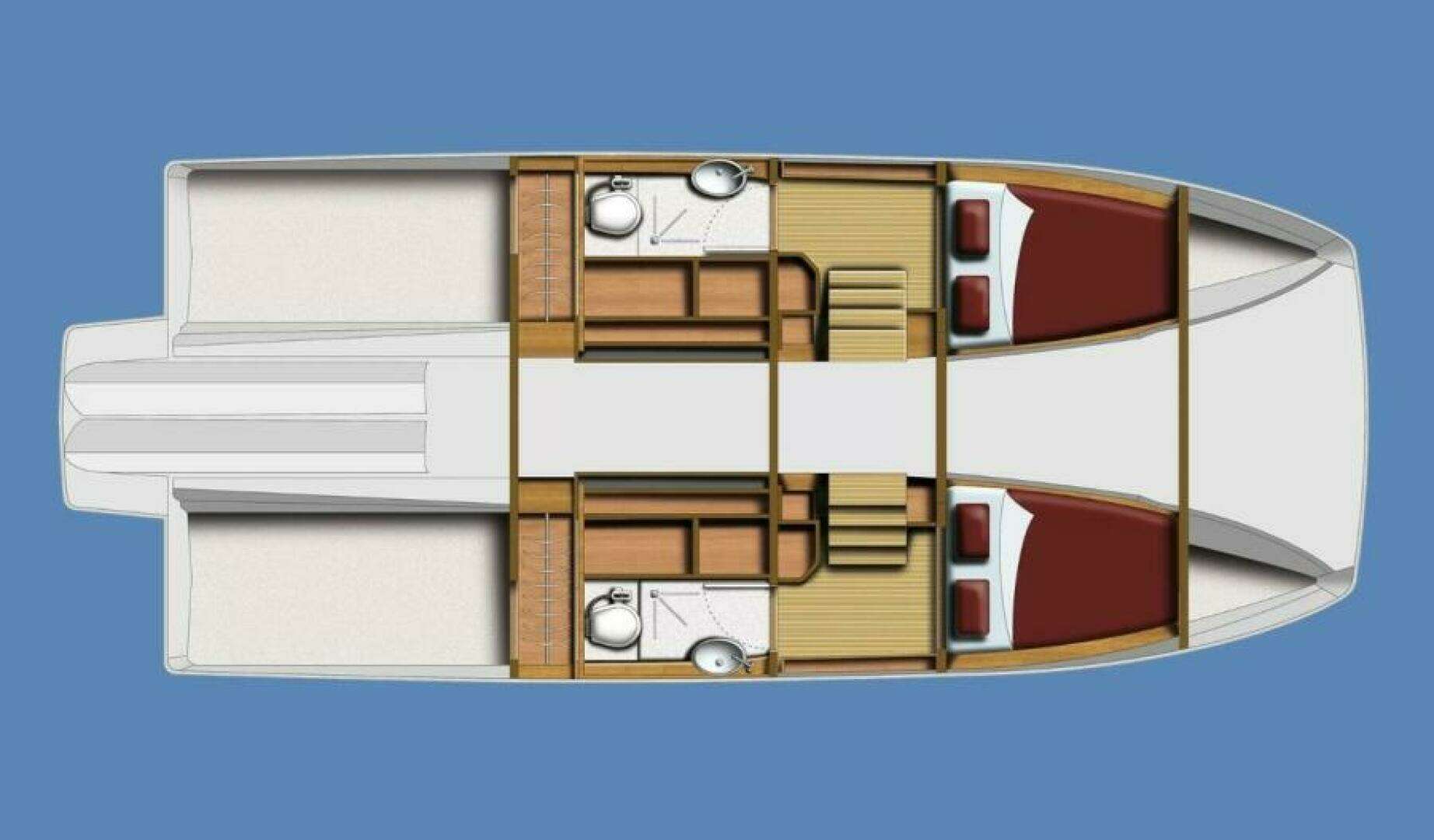 Below, two well-appointed cabins—each with its own en-suite—make overnights surprisingly comfortable for a boat her size. The interiors are bright, clean, and modern, giving the spaces a welcoming, retreat-like feel.