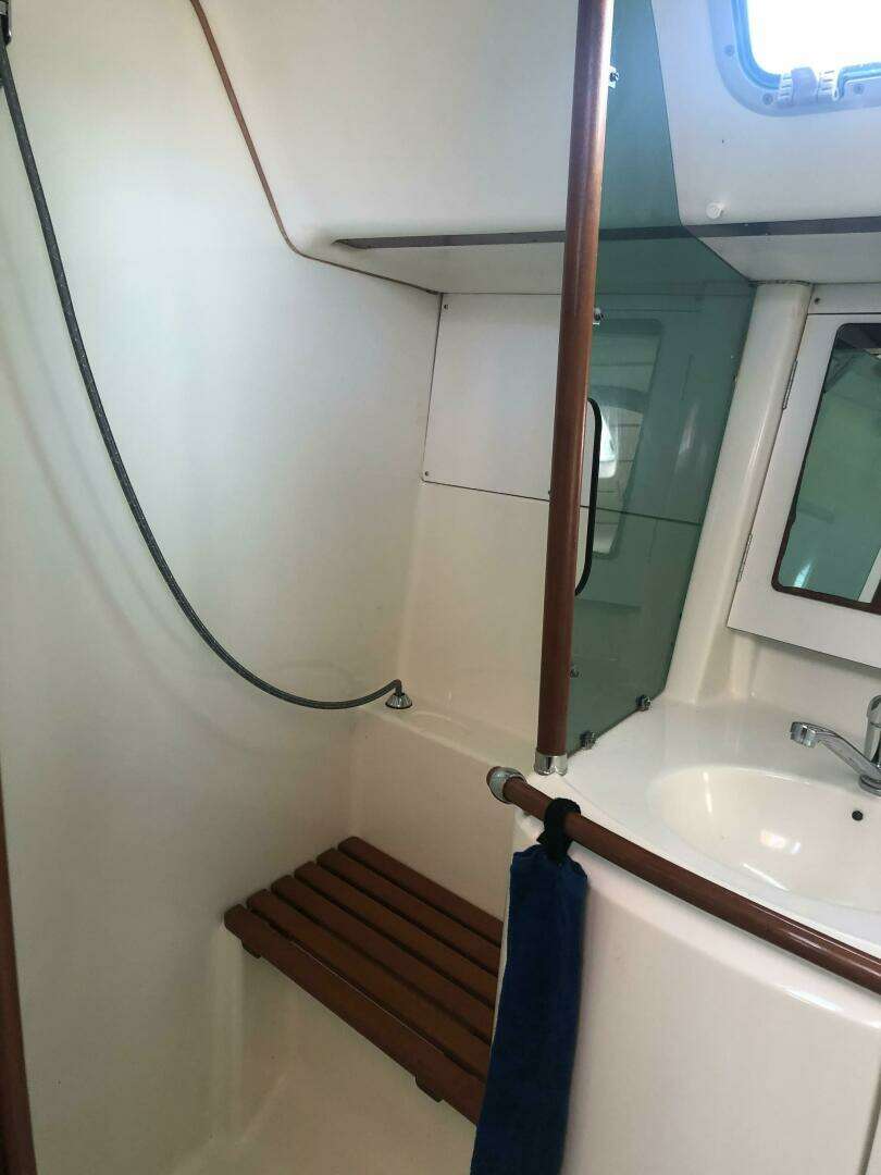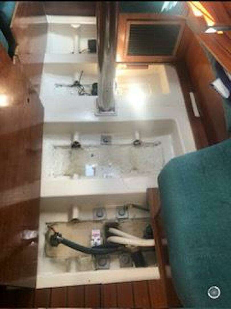 Coming down the companionway from the large, teak inlayed cockpit, you are in a spacious and comfortable main salon with 6'4" headroom. There is a u shaped settee to starboard and portside seats separated by an armrest cocktail table forward of the forward facing nav station. Aft in the main salon is a nicely appointed galley and a large head with separate shower. There is a large aft cabin to starboard and a V berth forward of the main salon. The feeling is warm and clean with exquisite woodwork in a cherrywood finish, a gleaming wooden cabin sole, and spotless bilges.