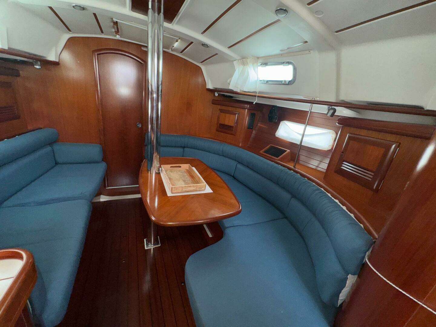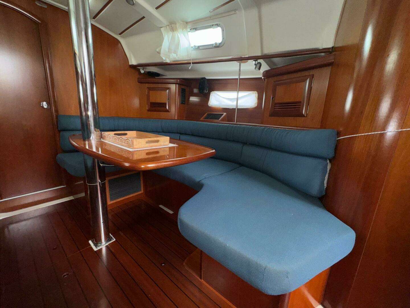 - Large U-shaped salon settee with convertible dining table to starboard