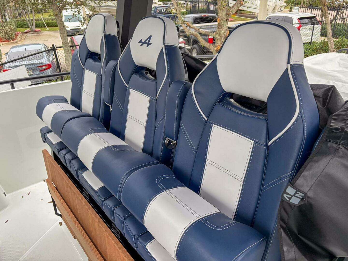 • Linetex Sphere Blue + Tannery Light Sugar exterior upholstery with Alpine embroidery