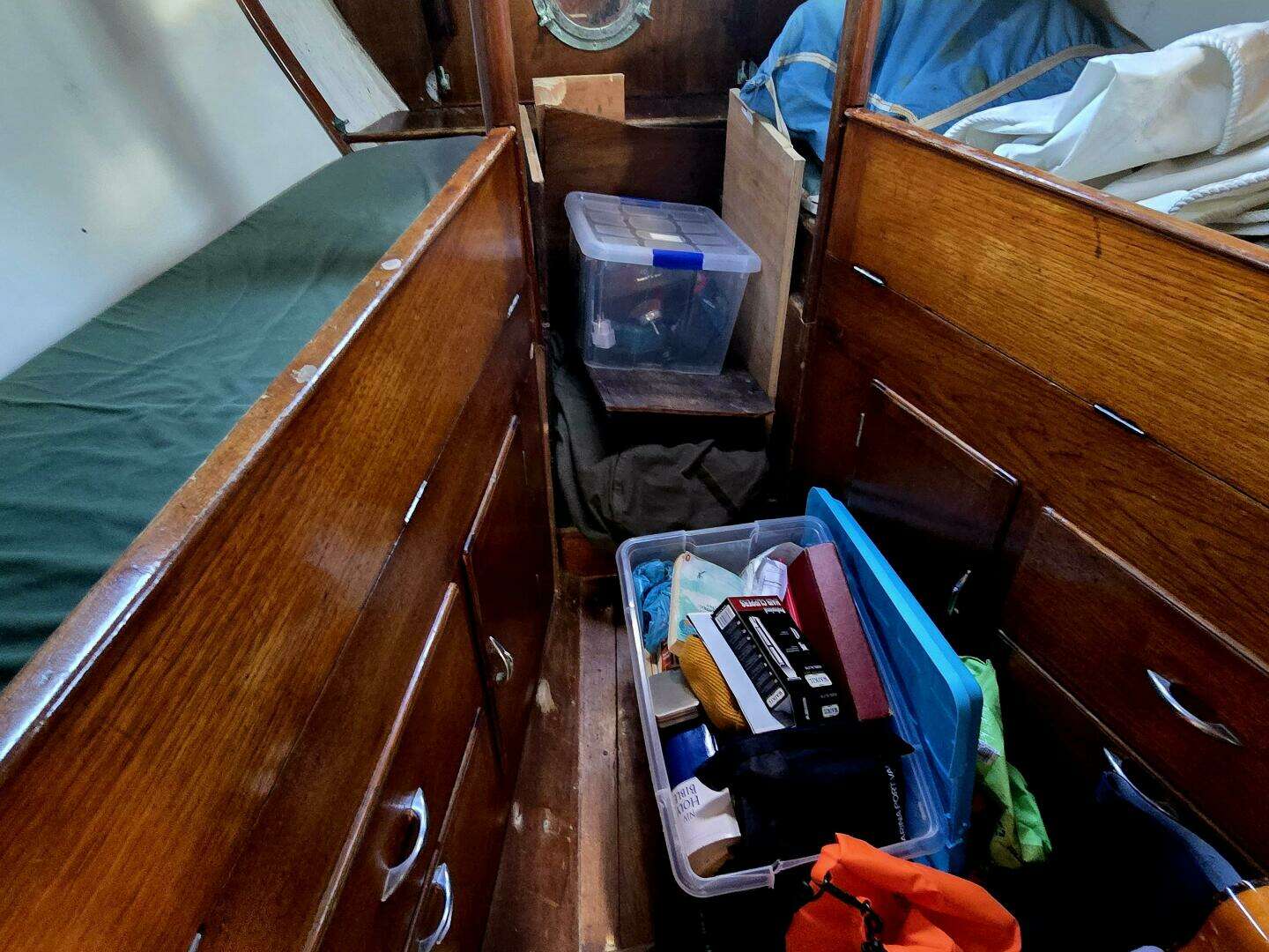 • (2) Single berths either side with wooden lee boards in mahogany