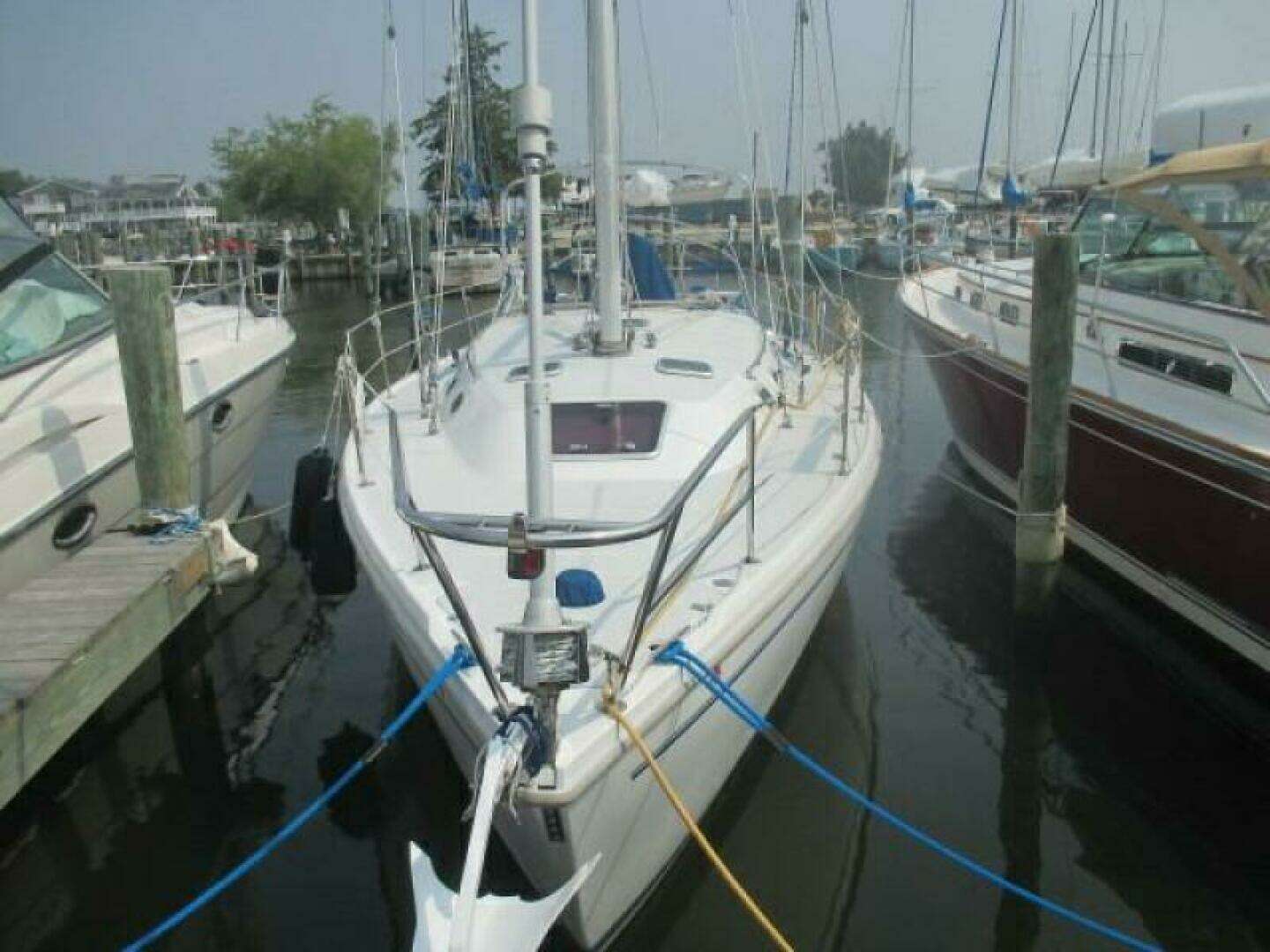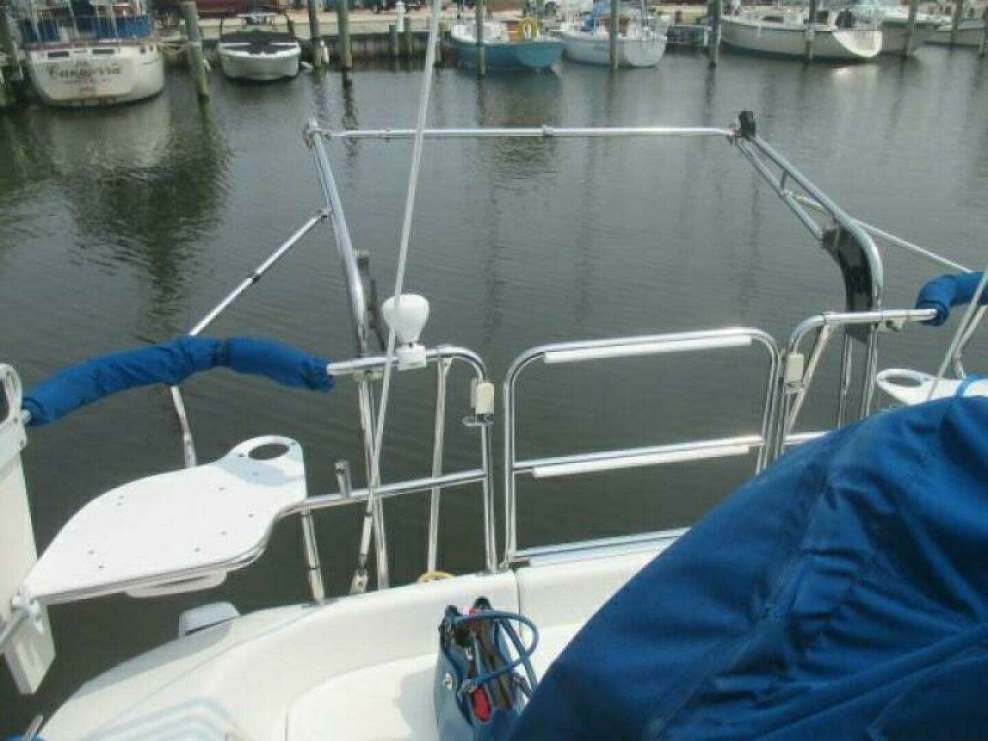 The Catalina 36 MKII is one of Catalina's most popular designs and is equally at home on a club course or coastal cruising. She is easy to sail by a couple, has a big comfortable cockpit, a spacious interior with two private cabins. A dodger with bimini and full enclosure will keep you protected from the elements and provide nice shade from the sun. A walk-through transom with swim platform and boarding ladder means you can easily board from the stern or at the port and starboard gates. The wide weather decks with handrails and double lifelines make passage to the bow safe and easy for handling lines. Below, you will find a spacious salon with convertible dinette to port, a convertible settee with table to starboard, and private staterooms fore and aft. The U-shaped galley has working refrigeration, stove, double sink, and ample counter space along with plenty of storage opportunities. The enclosed head with ensuite access to the forward stateroom has room to move around and a shower seat.