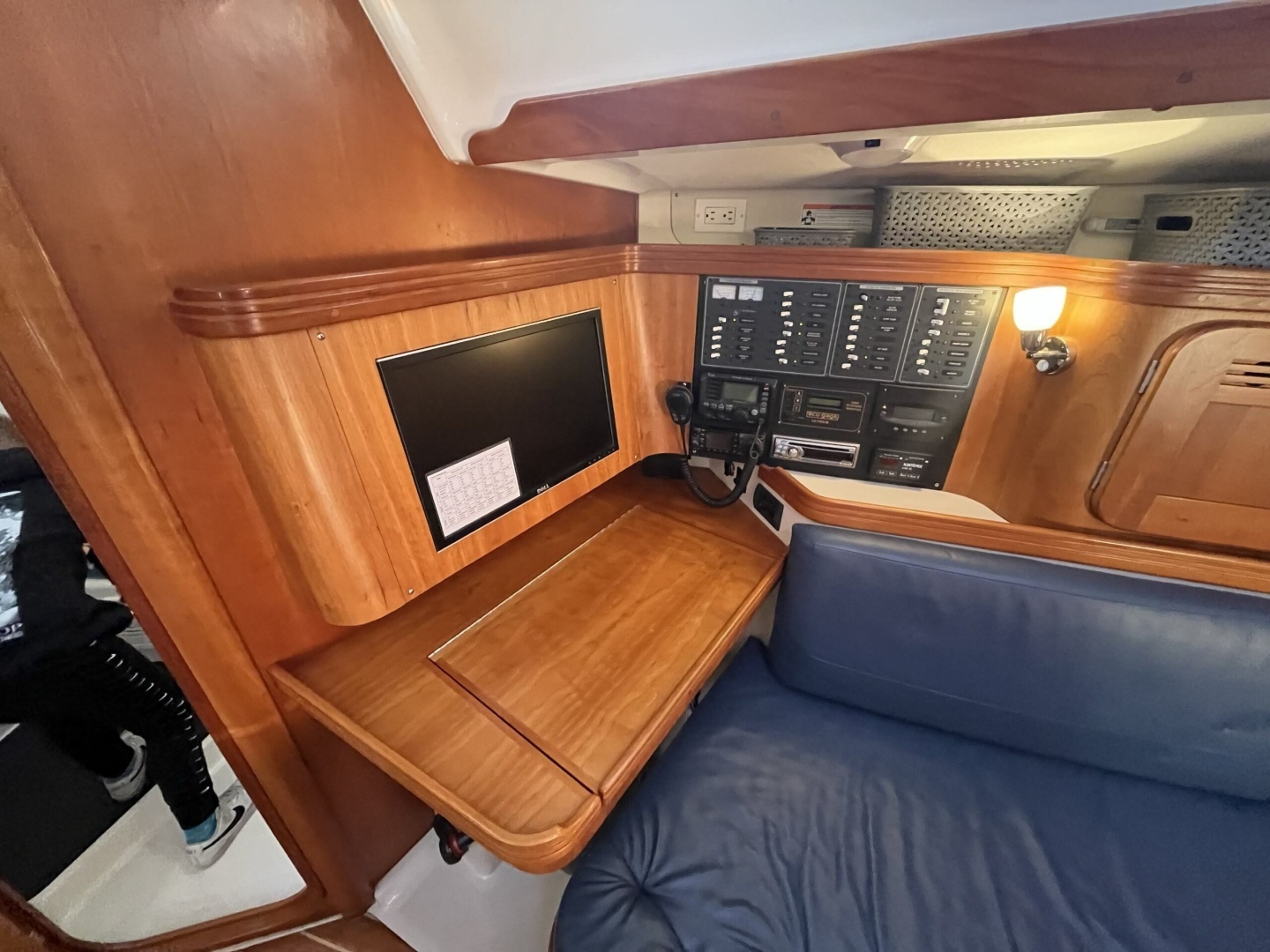 Opposite the galley is the dedicated navigation station with chart table and easy access to electrical distribution panels. It provides an ideal location for managing systems, reviewing charts, or operating navigation electronics.