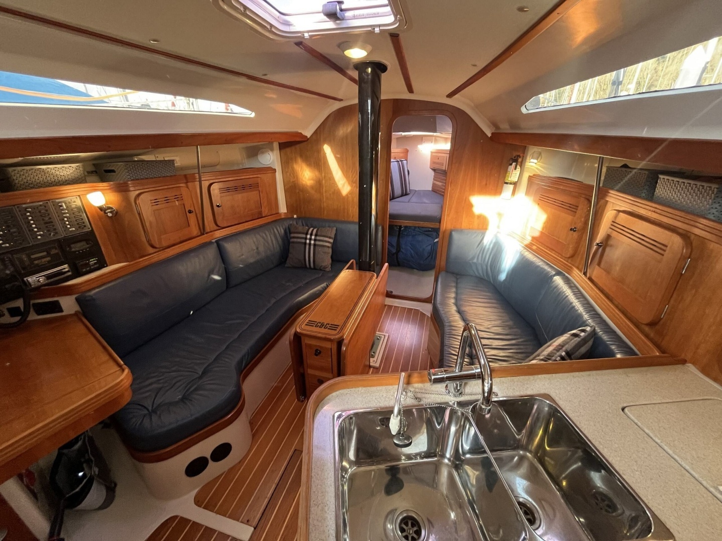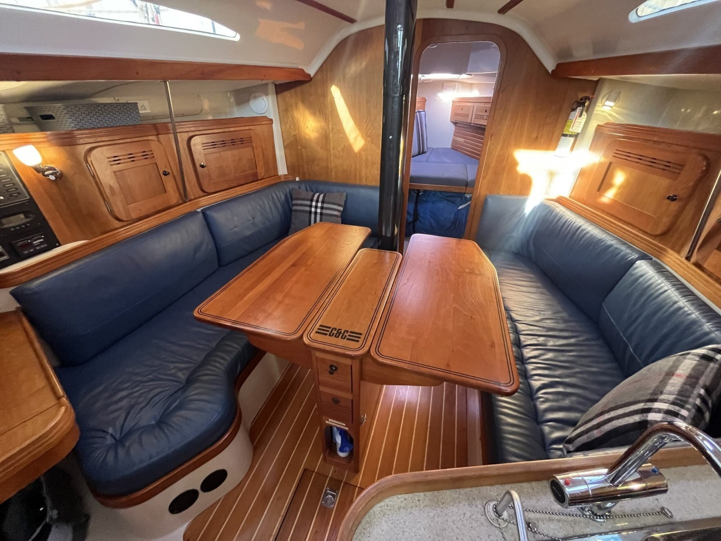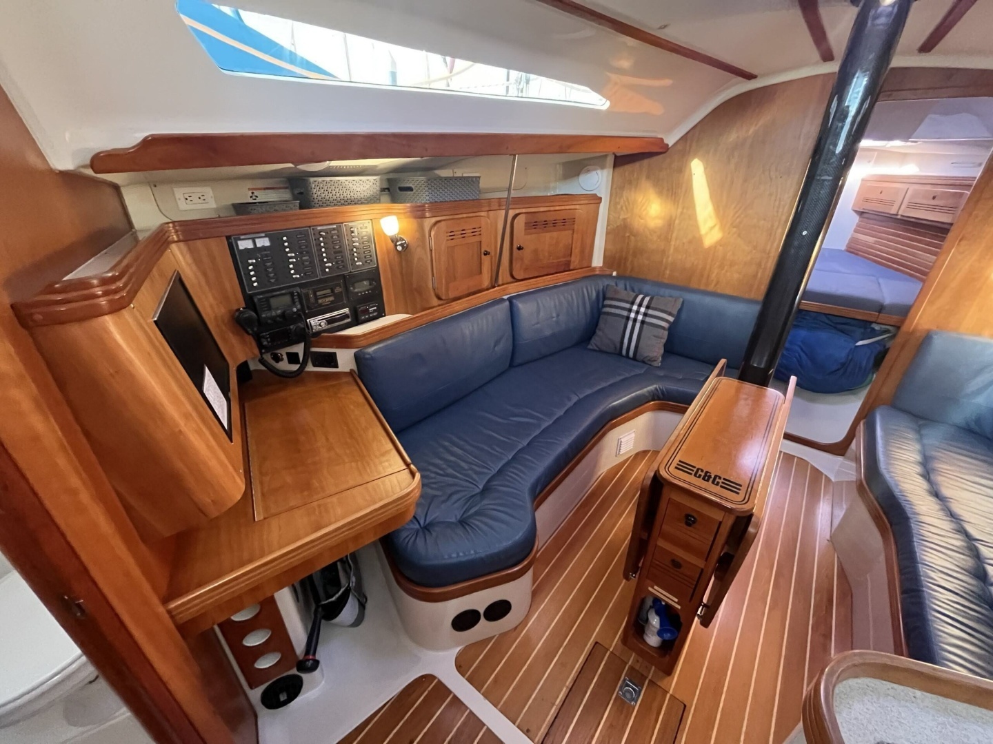 The interior of the C&C 110 is finished in satin cherry with a teak-and-holly cabin sole, giving the boat a bright and welcoming atmosphere. Fixed and opening ports flood the salon with natural light and enhance ventilation at anchor.