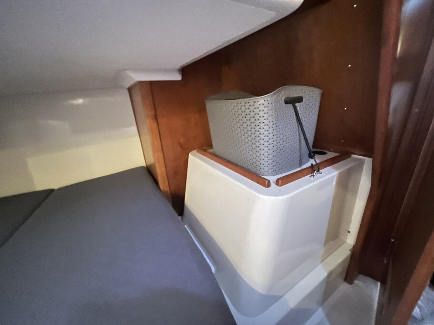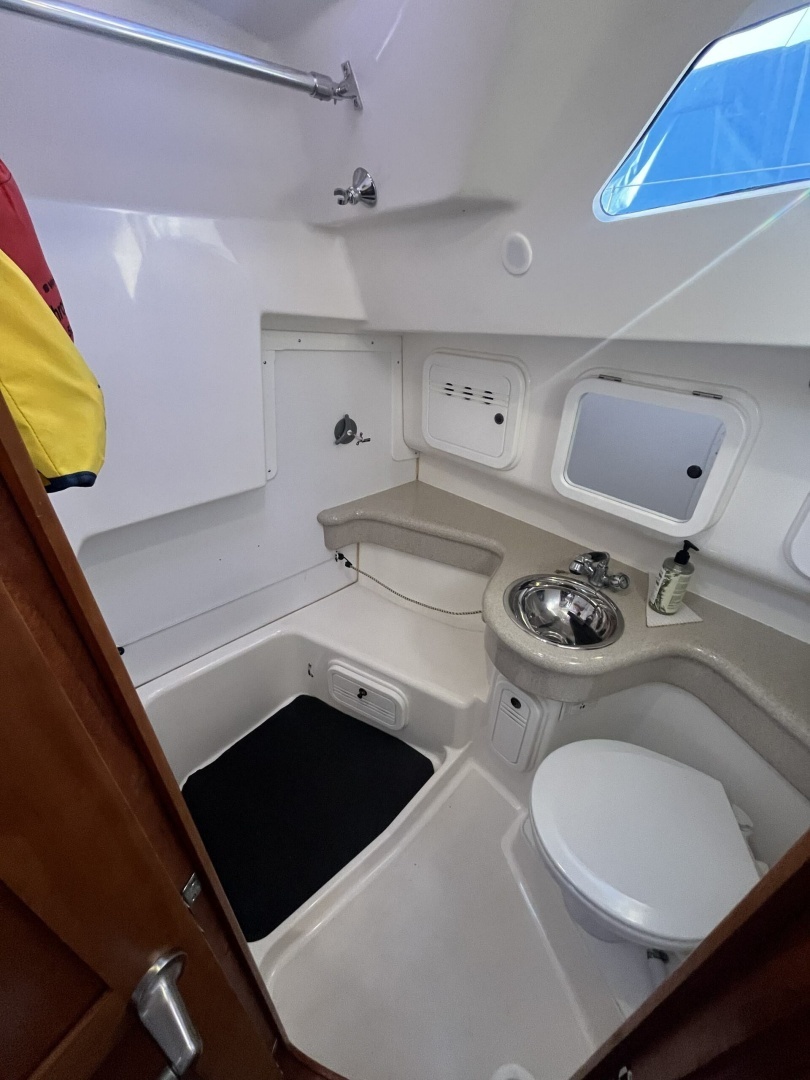 To port at the base of the companionway is the enclosed head with electric toilet. The aft end of the space is used for a shower and there is a bar for hanging wet weather gear.