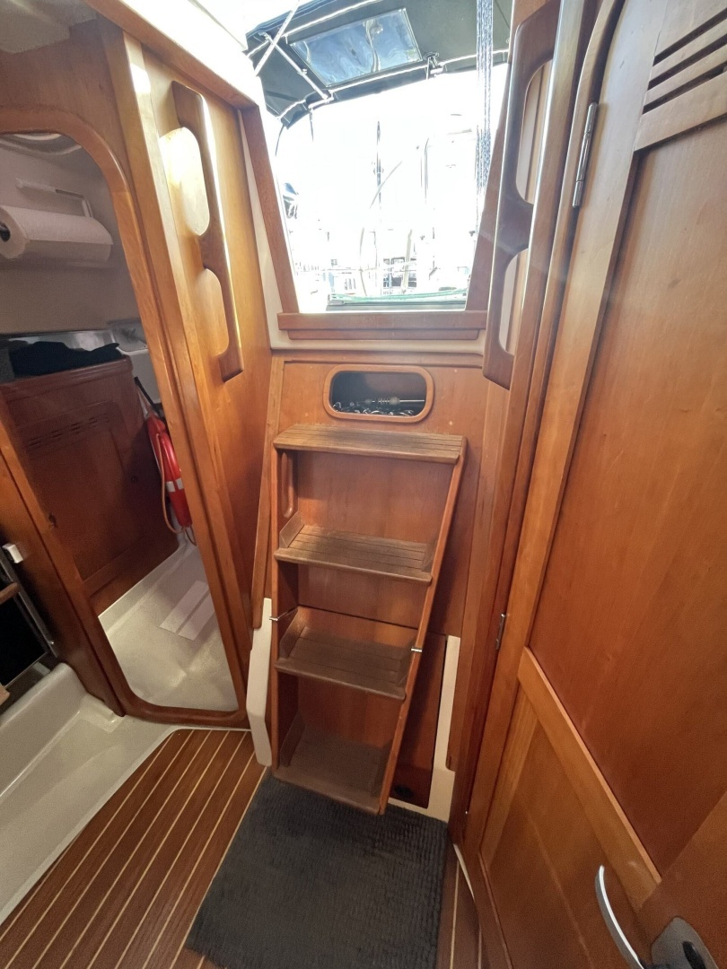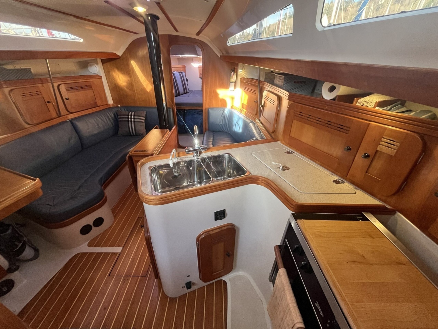 To starboard at the base of the companionway is the L-shaped galley, secure under sail and well-equipped for onboard cooking. The galley includes a deep stainless-steel sink, two-burner gimbaled propane stove and oven, and a large top-loading refrigerator. Ample counter space and lockers make meal preparation practical underway or at anchor.