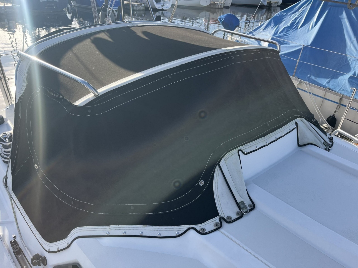 Custom bimini with stainless steel frame and connector piece with two windows and covers (2018)