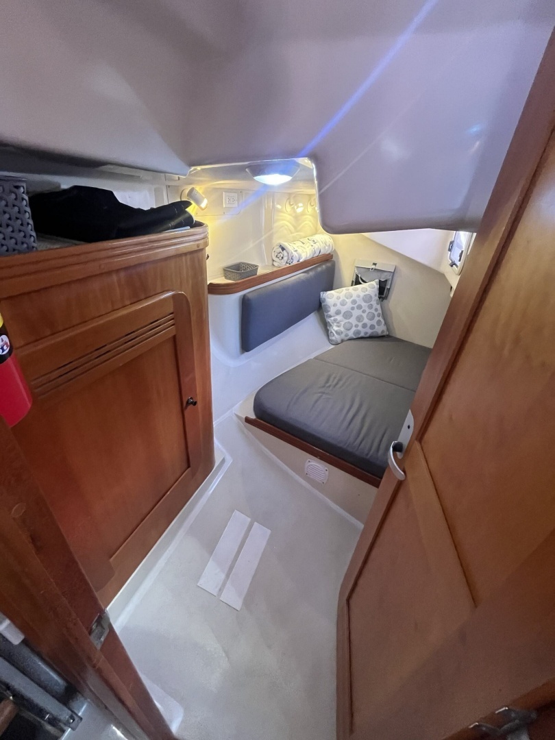 The aft cabin offers a large athwartships oriented double berth with excellent ventilation and locker storage. There is very good access to the aft end of the engine via a removable panel in addition to the access beneath the companionway.