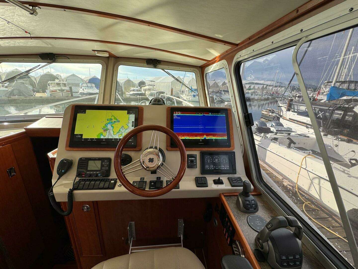 - Aft cockpit helm with 12” Garmin chartplotter, joystick and bow thruster control, autopilot control, and a bank of lockable drawers for fishing supplies