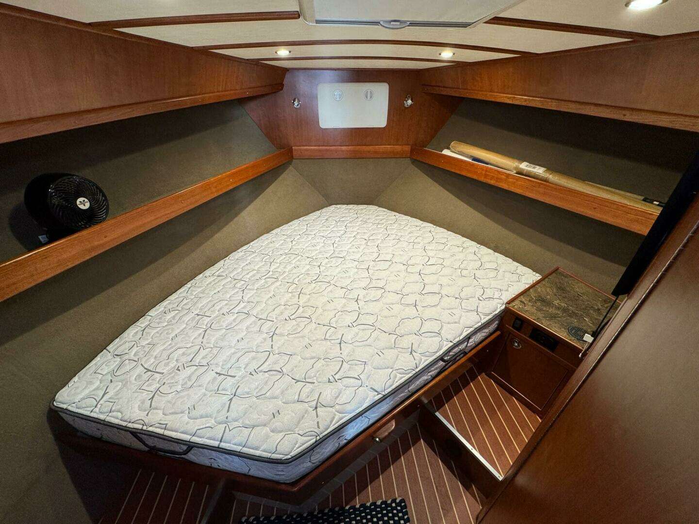 - Forward cabin includes a flat-screen TV