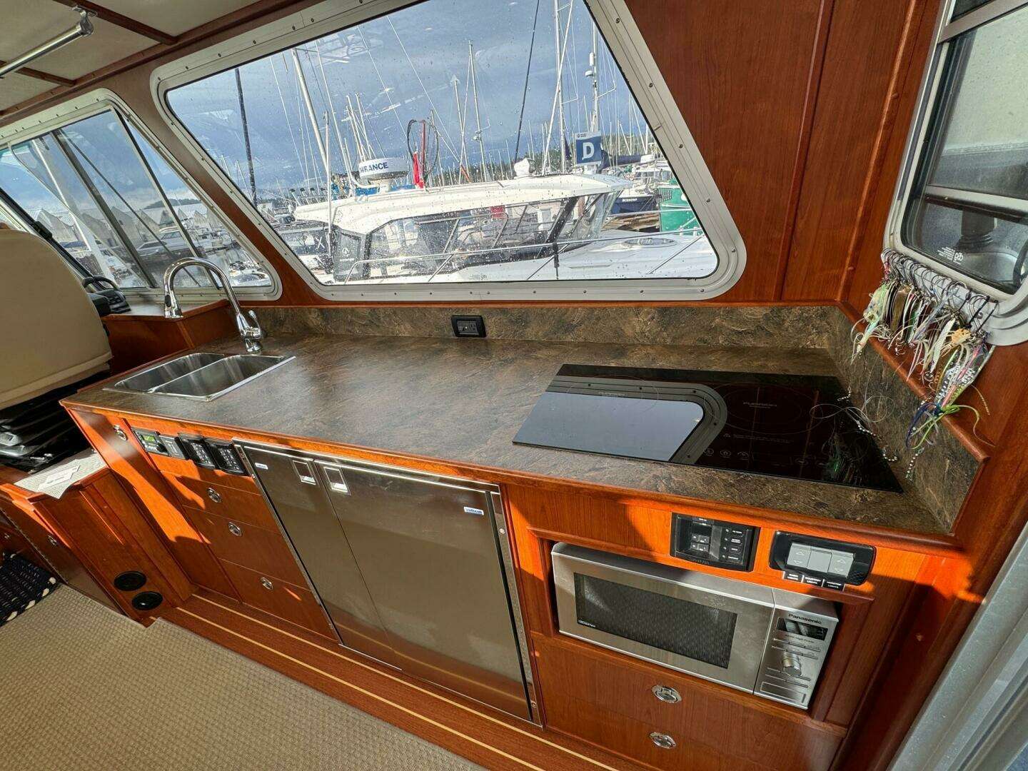 - Galley with stainless sink, induction cooktop, side-by-side refrigerator/freezer, and microwave