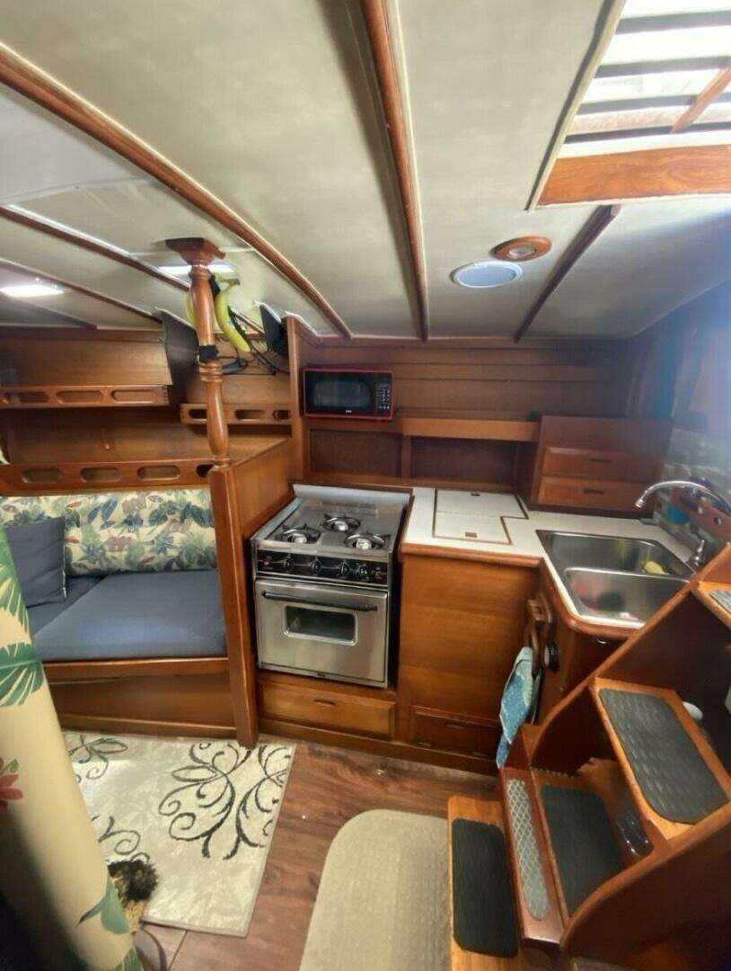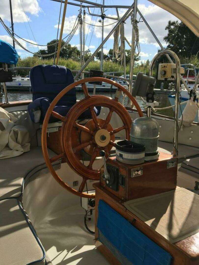 Because of her flush deck and design, you will not find another boat of this size and price with as much space below with an aft cabin for 2 people with private access to the head. We love her large cockpit as it’s more like another room with an over-sized dodger and full curtains to keep those bad days outside. She handles docking very well with her prop walk in reverse, which is offset by her large stern hung rudder. The mechanics of steering being under the rear seat in the cockpit means you’ll NEVER have to crawl under a bunk or locker to access a steering quadrant or issue. Because the rudder is hung off the stern you can back her straight for any distance you want or need. Because of the keel, prop walk and rudder design she can be turned around inside her own length if needed. Piloting her from the very large cockpit is very comfortable with all her instruments and big wheel. Because the companionway is not centered but offset you will look straight out from your station through the dodger opening with great visibility. I will miss piloting her the most.