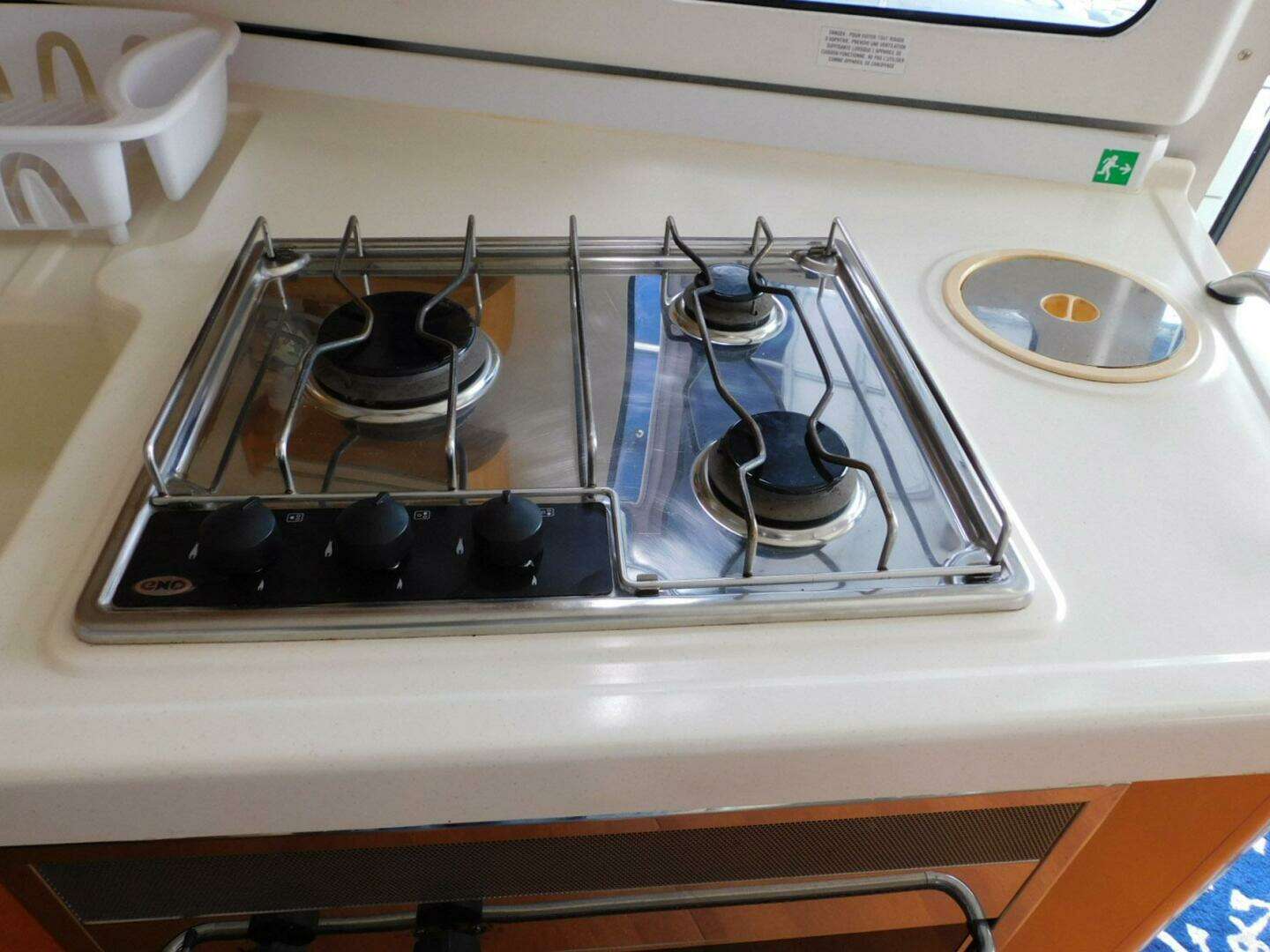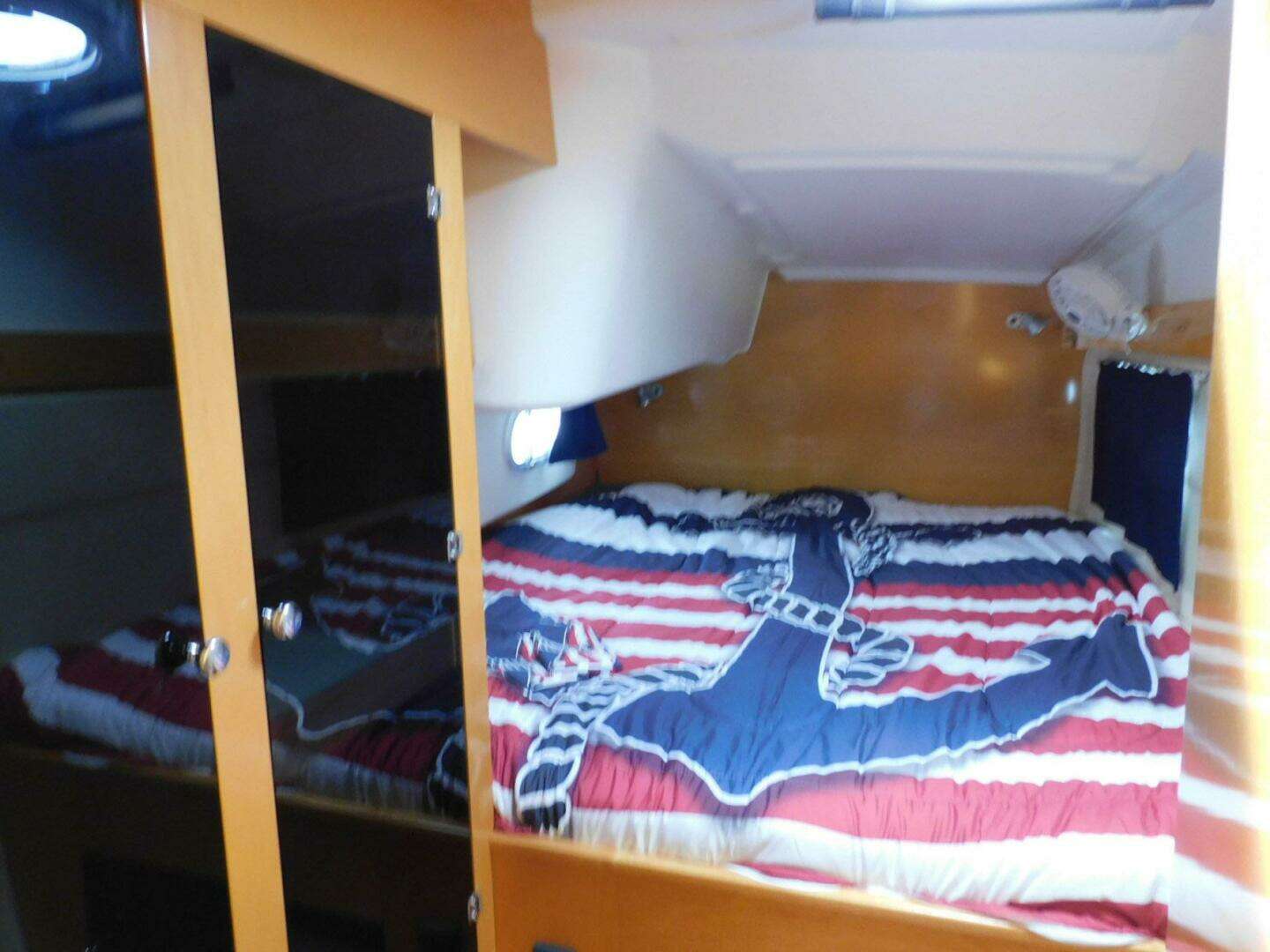 The main cabin and head are located in the starboard hull, opposite in the port hull are the two guest cabins.