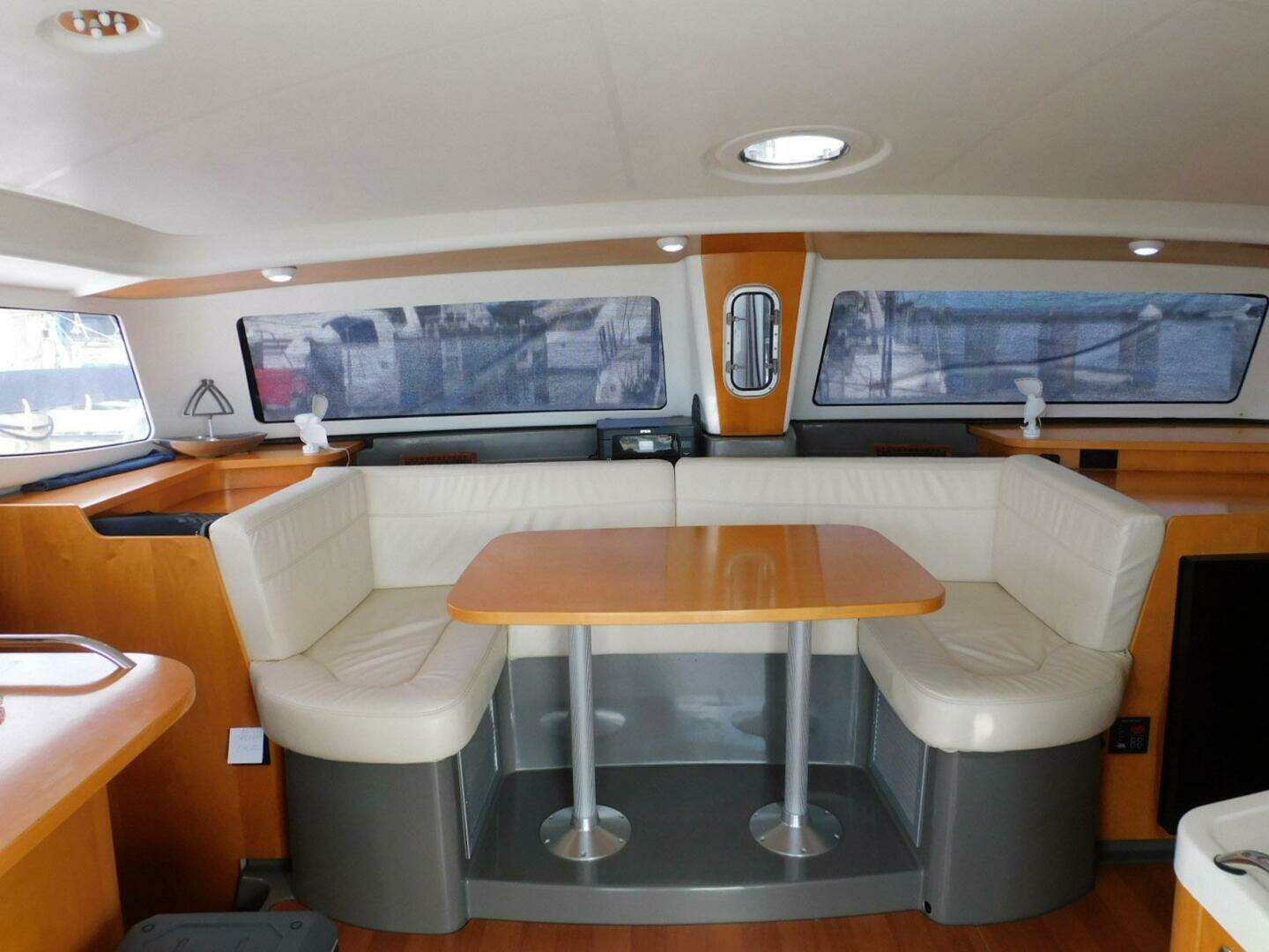 The dinette sits six adults, with the galley to starboard and the chart table to port.