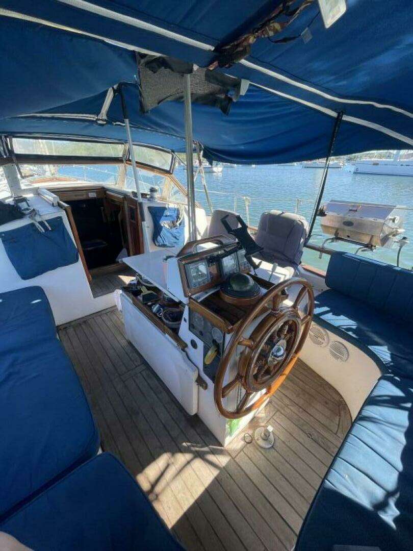 On deck, she is set up for easy short-handed sailing with roller furling sails, a well-protected cockpit, and a conservative sail plan. The mast, standing rigging, and hull-mounted chainplates were replaced in 2015, and the North Sails inventory remains in good condition. Ground tackle is robust, with a Rocna primary anchor, rebuilt Lewmar windlass, and ample chain and rode for comfortable anchoring.