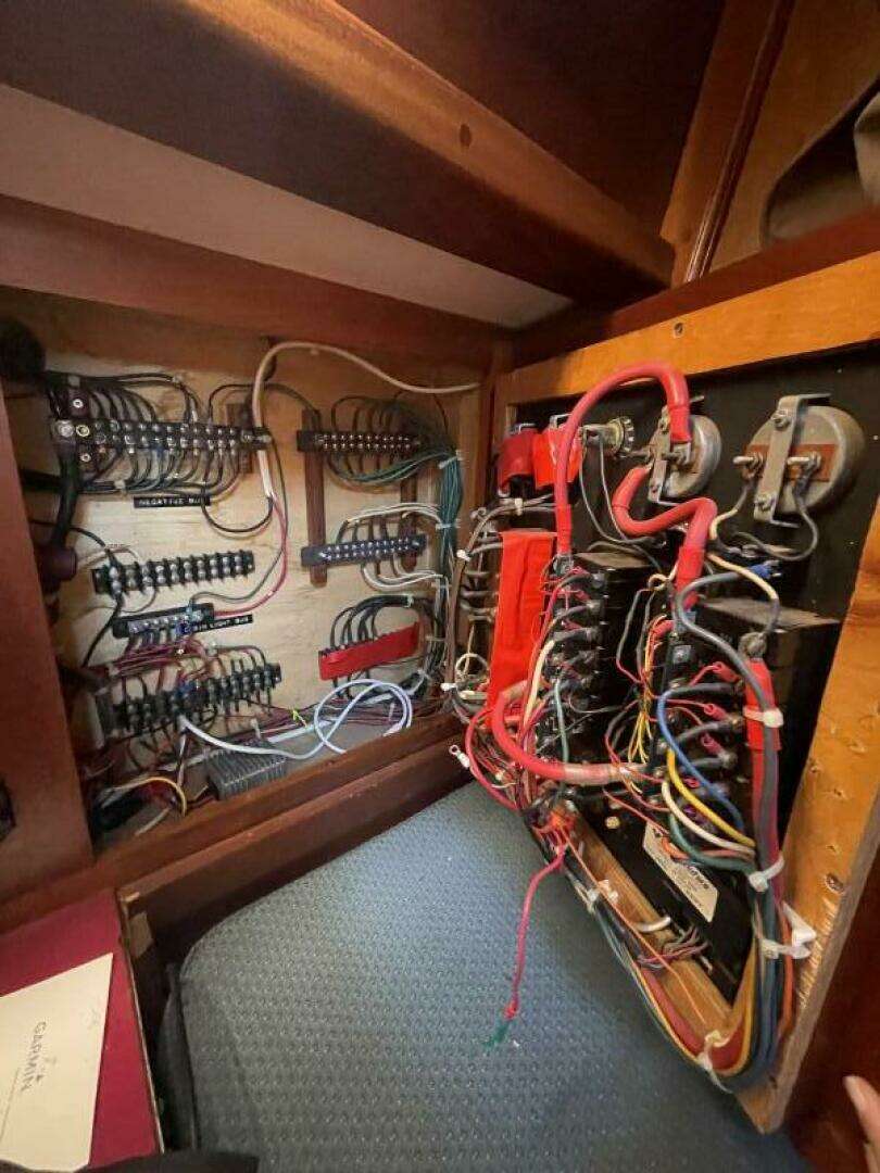 Power comes from a Westerbeke 55D installed new in 2015, with approximately 1,200 hours and extensive drivetrain updates. A strong electrical system with solar, inverter/charger, Firefly AGM house bank, and a Honda generator supports life off the grid.