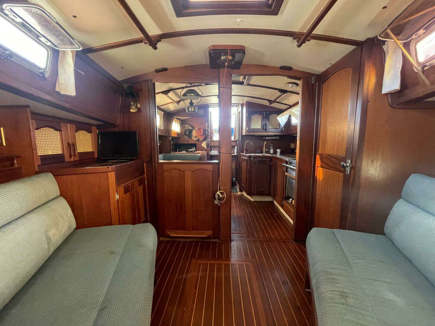 Below deck, the interior is warm, practical, and exceptionally well thought out for a boat of this size. The layout features a forward double berth, a convertible saloon table that creates a second double, and a generous aft single berth that serves as an excellent sea berth. With 6'2" of headroom, ample storage, and quality woodwork throughout, she feels solid and welcoming rather than cramped.