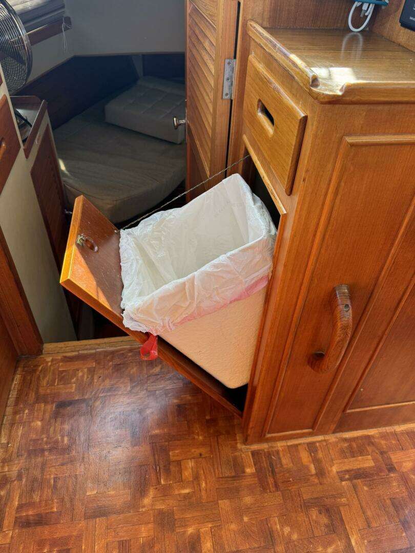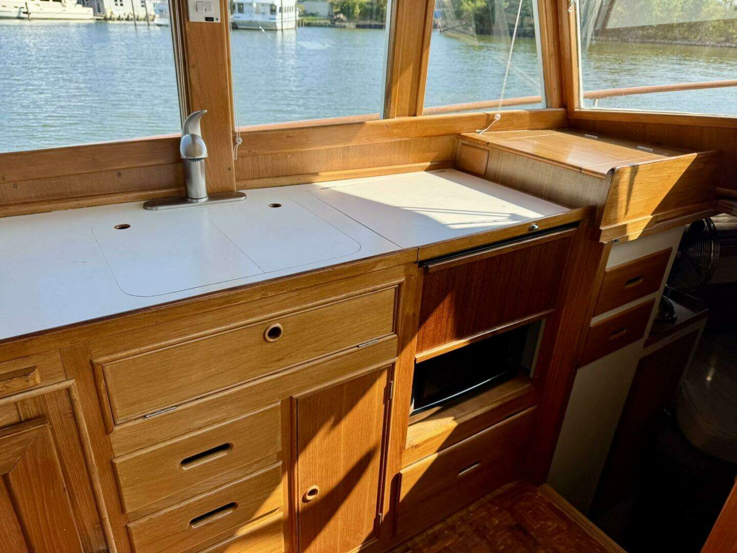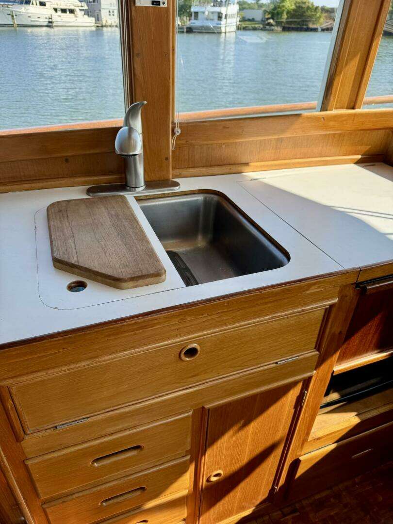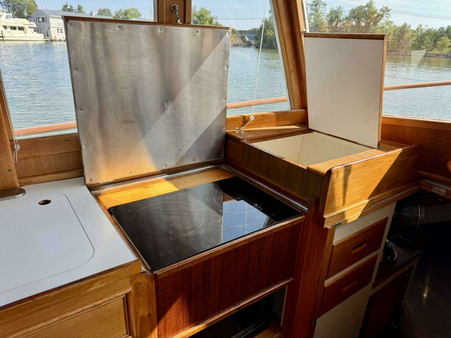 The galley is forward to the port side and features an induction electric cooktop and microwave 2022. Refrigeration is in the Grunert holding plate fridge with a Sea Frost compressor and holding plate replaced in 2018 with a new pump in 2024. There is a portable AC/DC freezer installed in the port seat locker aft of the galley. The faucet in the galley along with faucets in the guest heads were all replaced in 2022. There are freshwater filters before the water pump and at the galley sink.