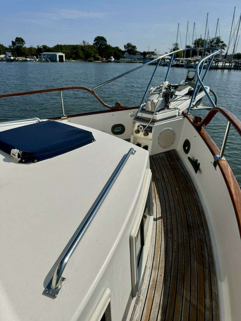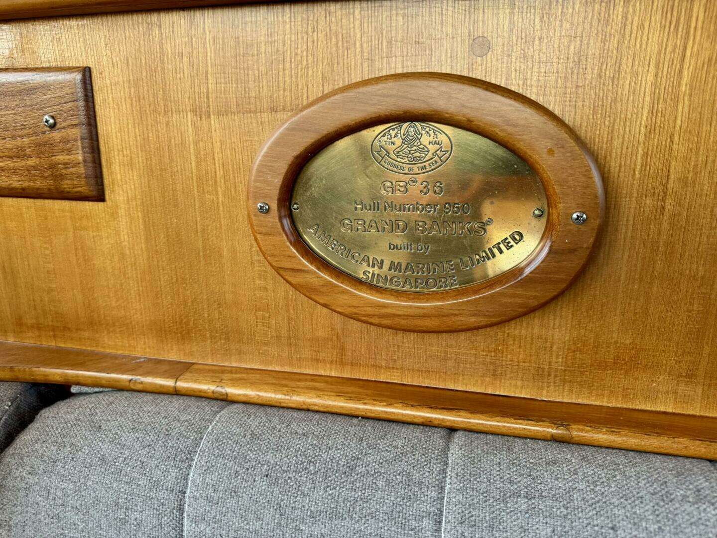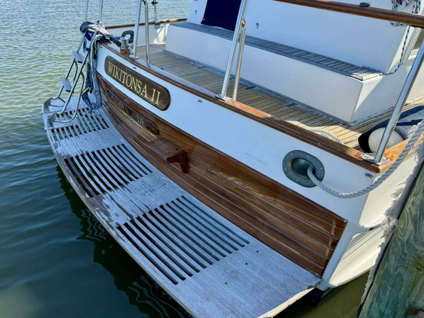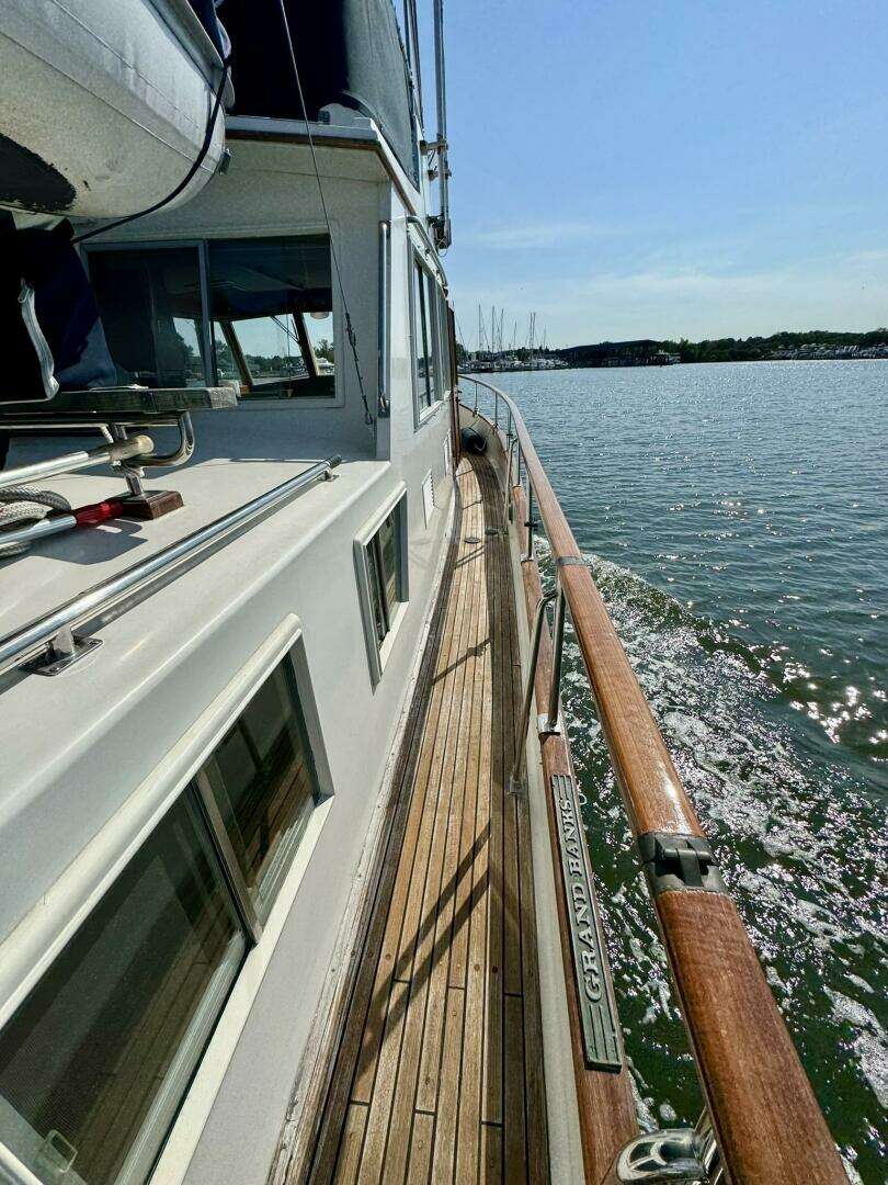 Step onboard this GB 36 Classic through the boarding gate on the port or starboard side. Her teak decks span fore and aft and were serviced in 2022 along with the lexan hatches. The varnished rails, cap rails, and salon windows have canvas covers (2022) as well as the bridge console, hatches, transom, doors, and forward windows. The window frames were repainted in 2024.