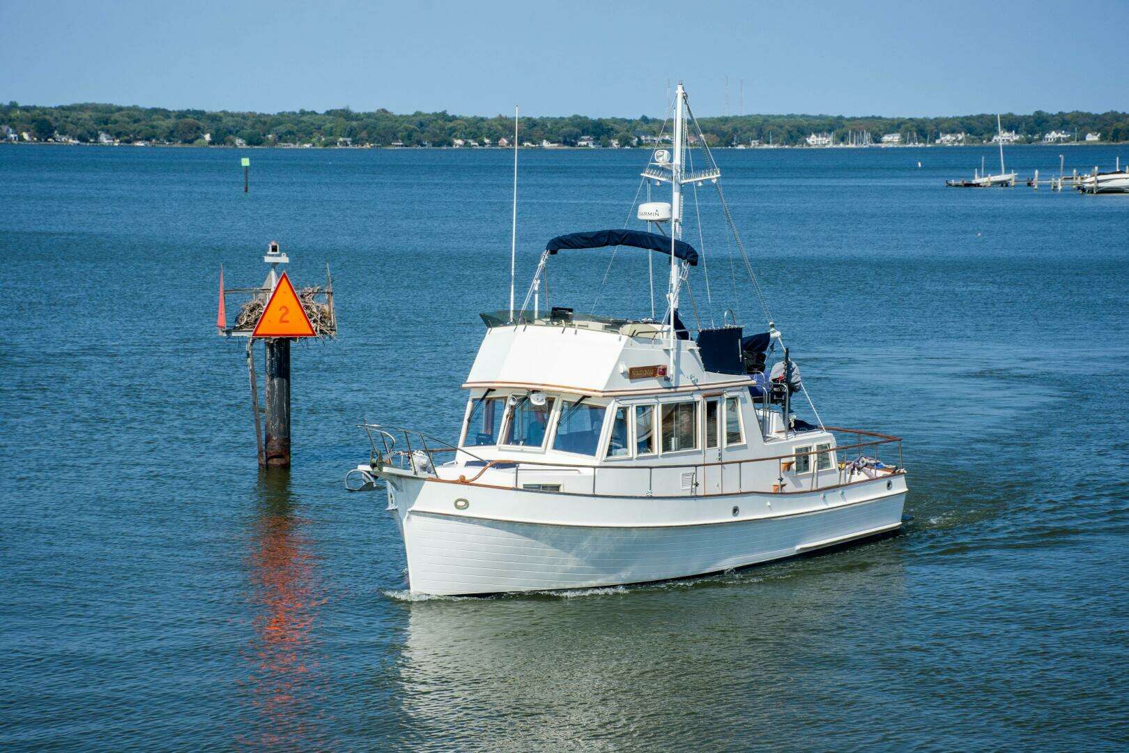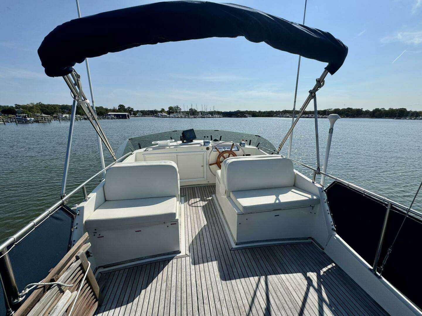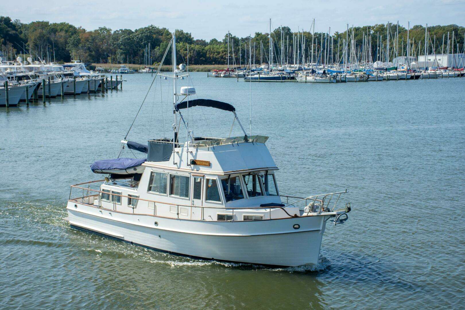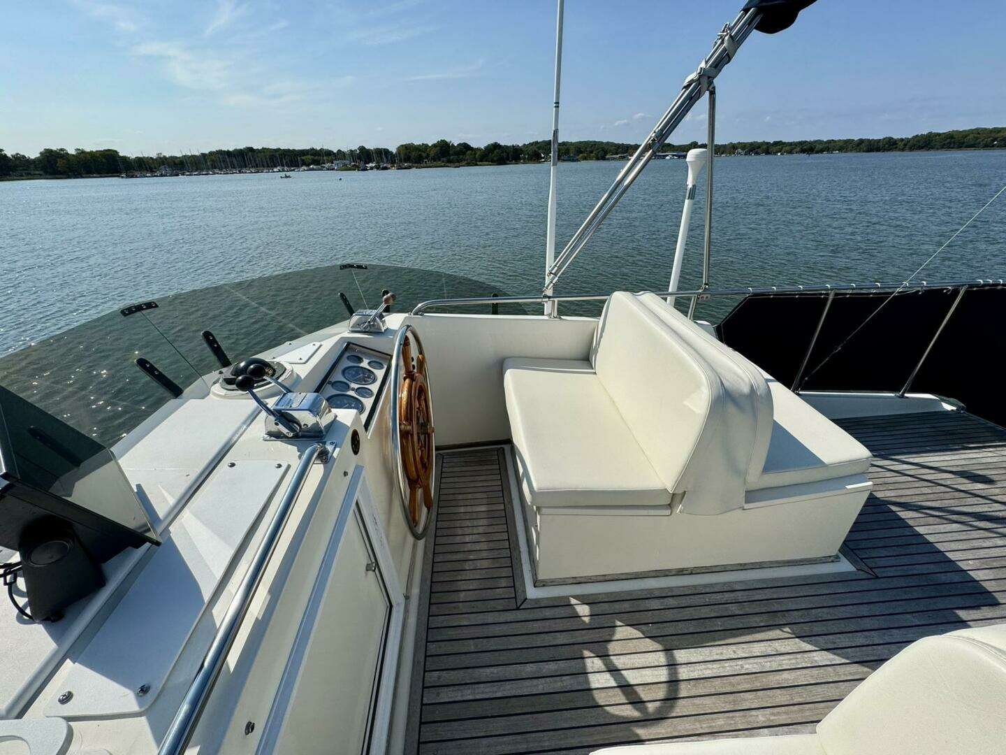 Step onboard this GB 36 Classic through the boarding gate on the port or starboard side. Her teak decks span fore and aft and were serviced in 2022 along with the lexan hatches. The varnished rails, cap rails, and salon windows have canvas covers (2022) as well as the bridge console, hatches, transom, doors, and forward windows. The window frames were repainted in 2024.