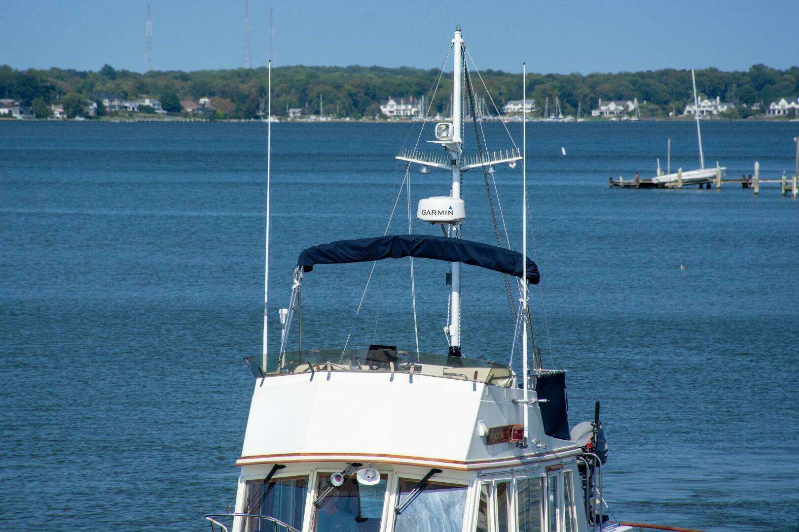As you move aft, look up at the traditional Grand Banks mast was removed for a repaint and wiring along with new spreader lights in 2022.