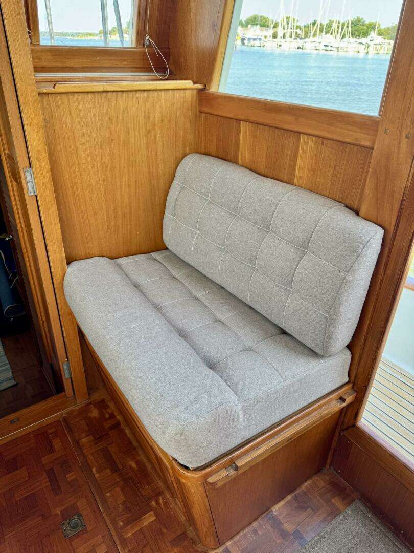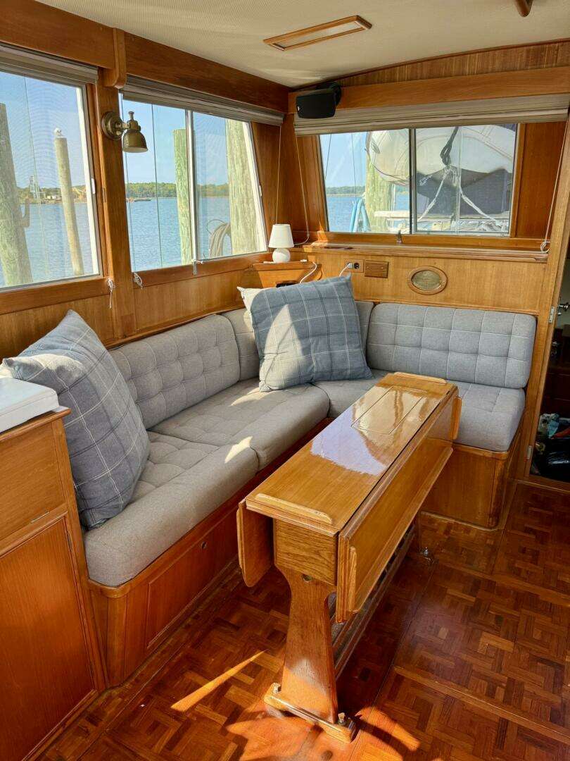 Moving back below to the main deck and entering the salon sole was stripped and refinished in 2022 and received a re-coat in 2024 along with the rest of the salon interior. The L shaped seating area cushions were replaced in 2022. The traditional GB folding leaf table was stripped and refinished in 2024.