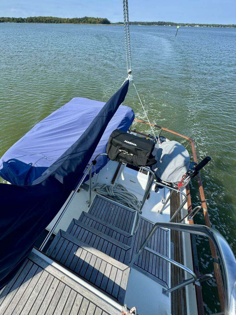 The Lazarette storage lockers are aft of the cabin and had the teak replaced in 2023. Note the swim platform was upgraded in 2023 with a 24” wide platform.