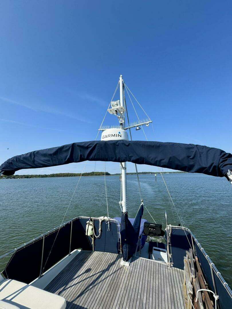 Moving forward and down brings you to the forward stateroom with a v-berth. Windows received new blinds along with paint and floor varnish in 2022. The floor received additional varnish in 2024. A wet head is located to starboard.