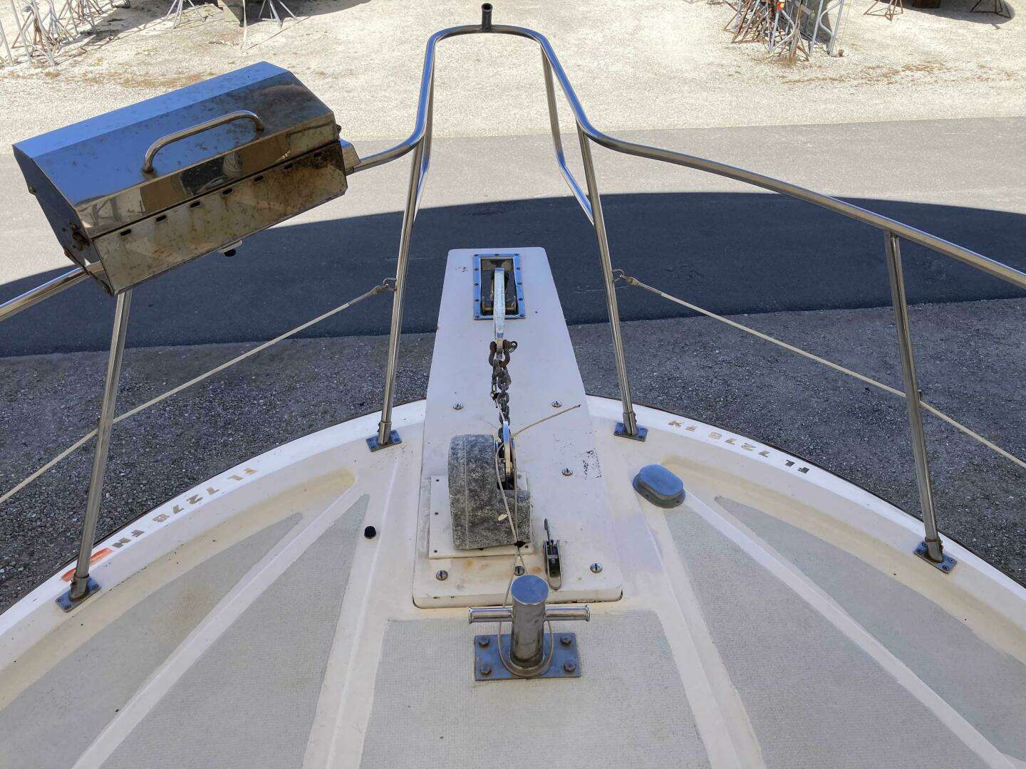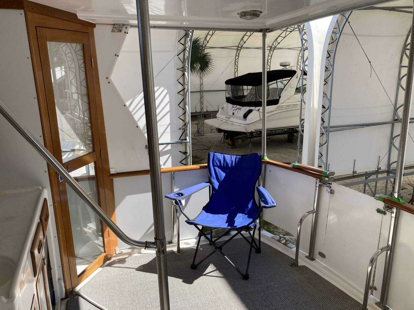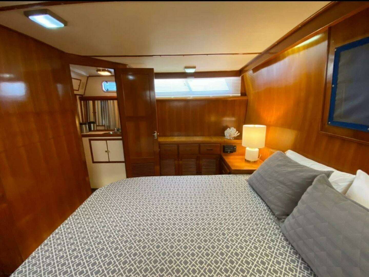 Starting forward is the guest cabin with a V-berth over/under combination having a double to port and a settee to starboard next to a hanging locker. Just aft to starboard is the guest head with a vanity and vacu-flush toilet. The galley is to port with the necessary appliances and storage that make life aboard hassle free. See details below. Moving aft and up 3 steps is the lower helm and salon. The lower helm is starboard with a sliding access door to the side deck. The salon includes a starboard settee, two lounge chairs to port, a moveable leaf opening table, a counter above the galley and additional cabinetry. All in an air-conditioned environment for comfortable inside living. The master stateroom is aft and down 3 steps. It has a centerline queen size bed, built in cabinetry on both sides and 2 hanging lockers. The master ensuite head has a vanity, vacu-flush toilet, cabinets and separate stall shower. Up from the salon to the aft sundeck you have a large relaxing and entertaining area. There is a full isinglass enclosure, plenty of seating and a counter bar with sink. This covered sundeck will be the focus for outdoor living at the dock or on the hook. Mattresses and seat cushions inside and out replaced in 2018. There is LED accent lighting in the salon, master stateroom & sundeck.