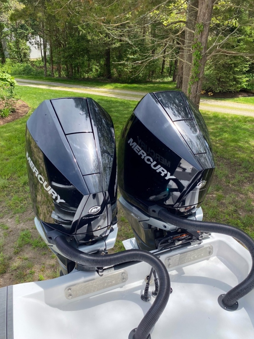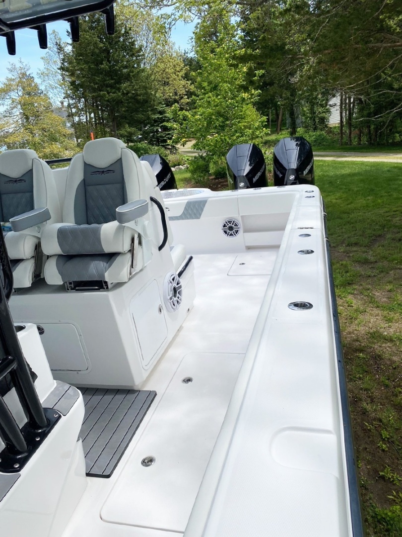 Stable, fast catamaran style, center console, great for inshore or offshore fishing or just enjoying a day on the water. Equipped with many desirable options such as side dive-boarding door, triple helm seating, trailer and FLIR night vision. New England boat, well maintained, tent and lift stored. Extended engine warranties through October 2026.