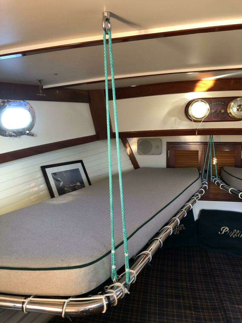 PUFFIN offers a traditionally styled open boat concept in true Lobster Yacht form and function. A V berth with filler offers sleeping accommodations for two while two additional pipe berths above allow for two additional single berths. There is a dining table on centerline, mirrored settees to port and starboard for seating at the table, galley to port and enclosed head to starboard. The fit and finish is true to form from the custom yard of John Williams and offered in true yacht finish.