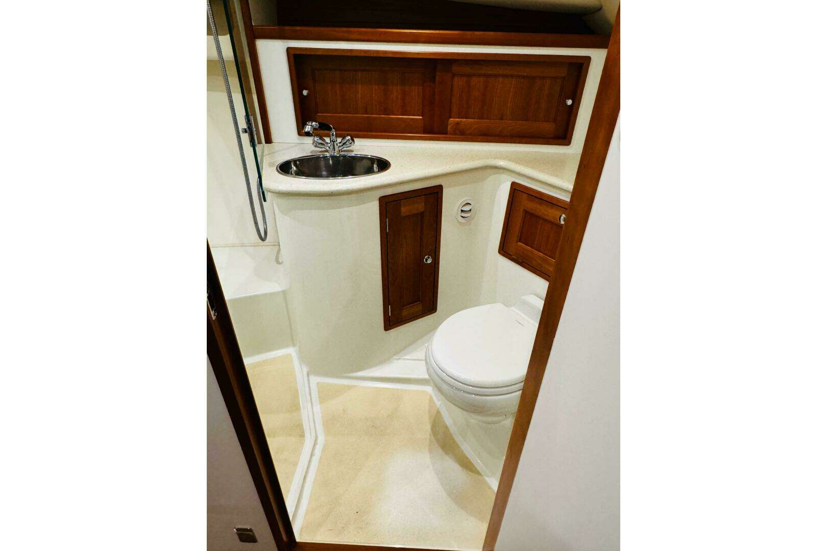 The enclosed head is to starboard with Sealand Vacuflush plumbed to the holding tank, Corain vanity with stainless sink, hot & cold pressure water, and separate stall shower compartment with seat, draining to a separate sump.