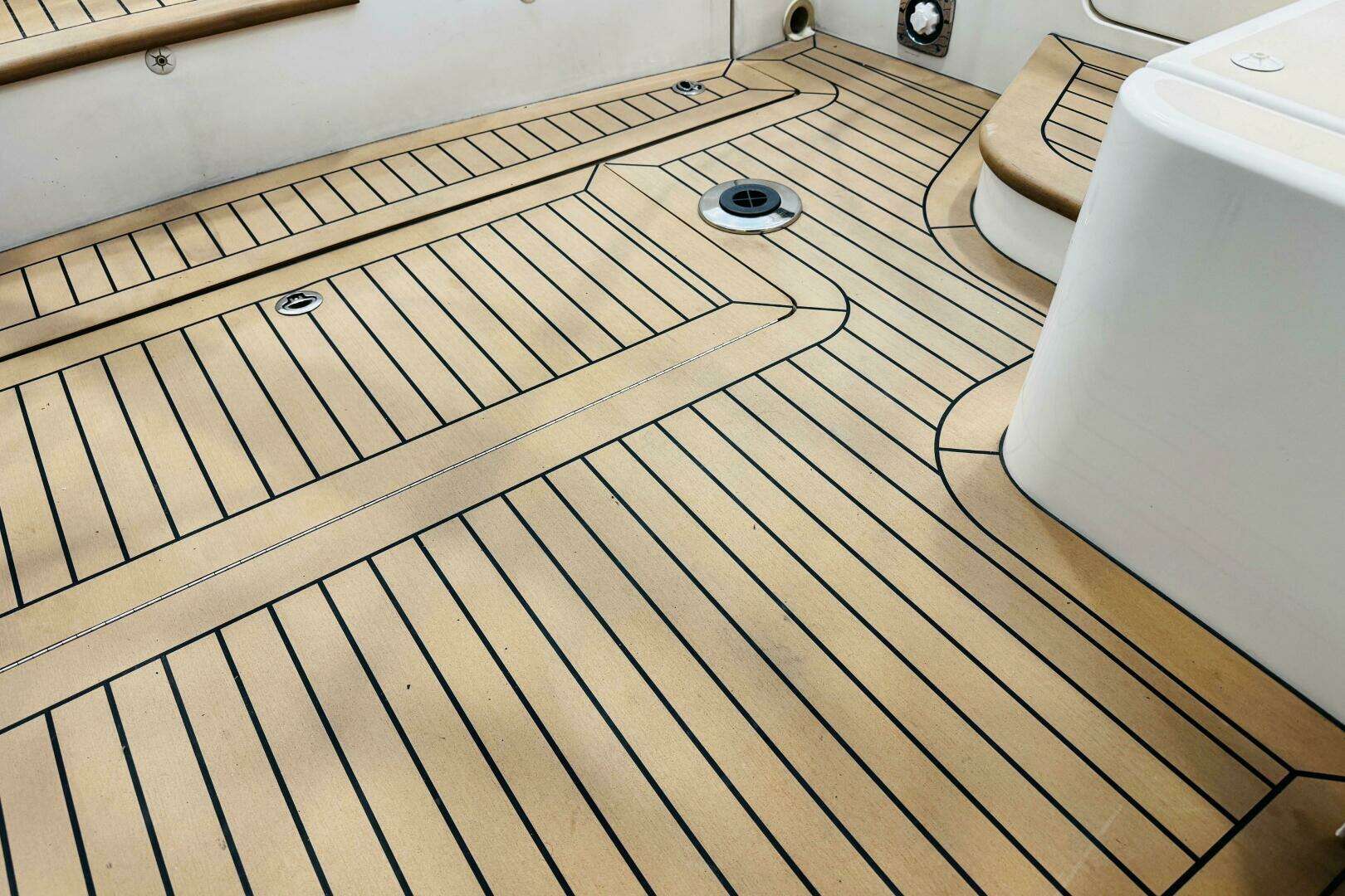 The wheelhouse flows, without interruption to the cockpit on a level deck with its two aft facing seats forward and the full width transom seat aft there is space for 8-10 owners and guests! There are side doors that make it so convenient to board just aft of the aft facing seats.