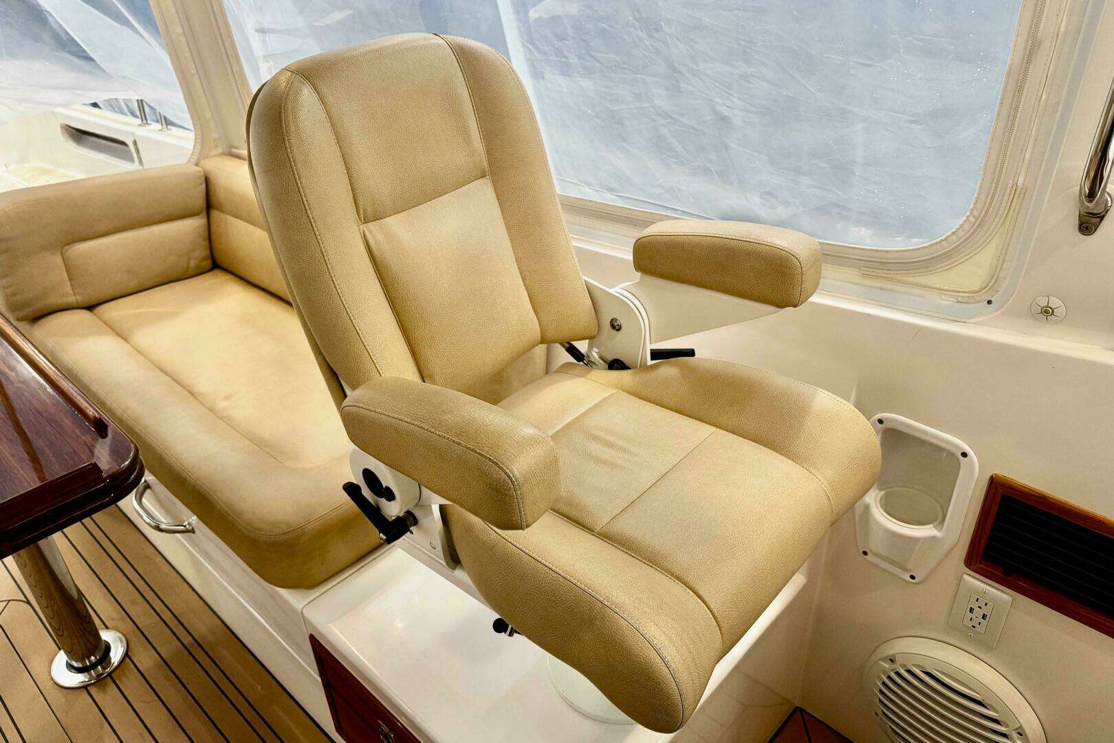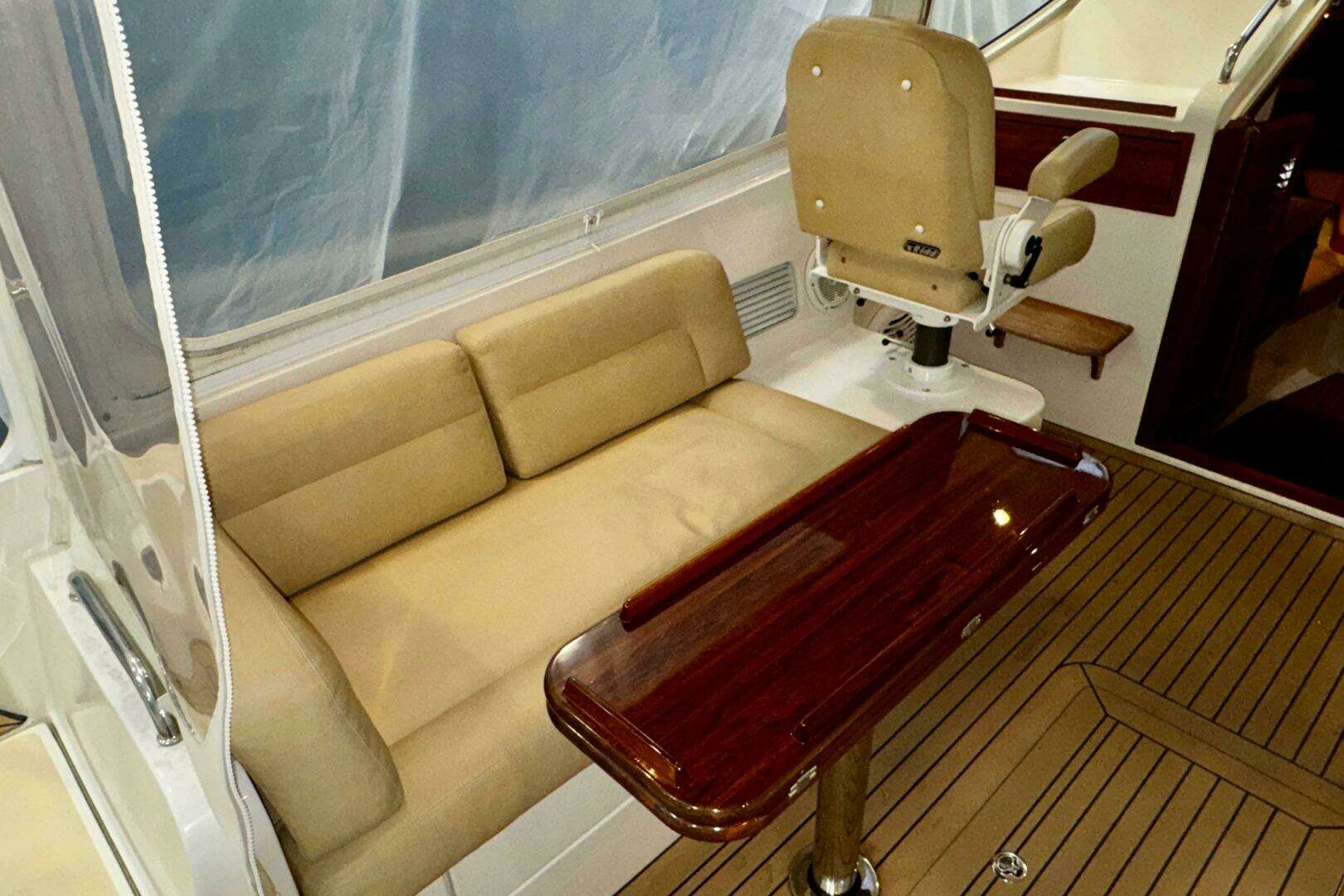 Up two steps (storage under) to the helm deck with helm station to starboard with all vessel navionics and controls and companion seat to port, both are Stidd 500N low back Admiral reclining seats with cargo drawers under. Aft of these are 6' settees Port & Starobard with what can only be described as voluminous storage space below, either locker is capable of holding bikes or golf clubs. The settees extend under the Stidd seats so with the Stidd seats elevated and cushions put down the settees make very comfortable berths. Dining is from a varnished teak pedestal table that will easily handle 4-6 for a luncheon. Additional storage is found below the hatch on centerline which also accesses auxiliary equipment. The wheelhouse is fitted with two overhead hatches with blinds and screens and the side and rear curtains are a breeze to roll up.