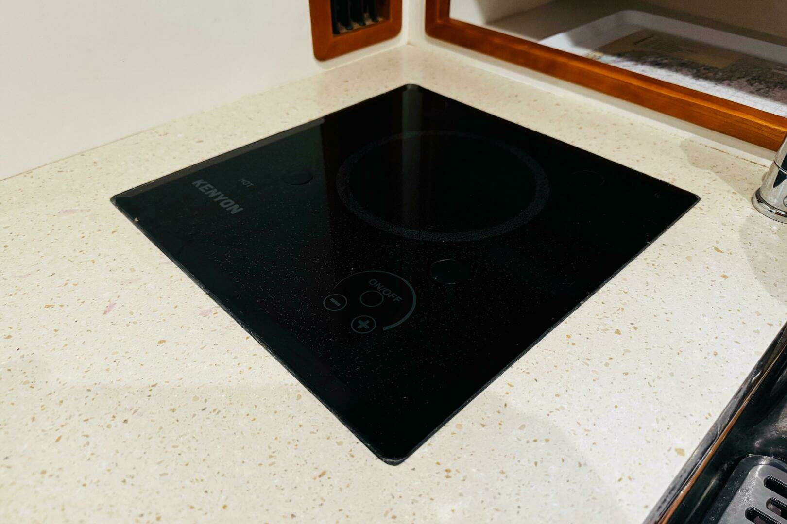 Aft and to port is the galley with Corian counter tops, top load refrigeration box with 12 Volt DC Seafrost system, Princess single burner ceramic cooktop that may be run through the inverter and microwave oven along with storage in 3 drawers and a number of lockers including a hanging locker just aft of the galley.