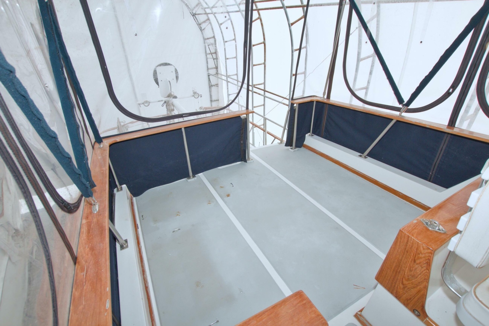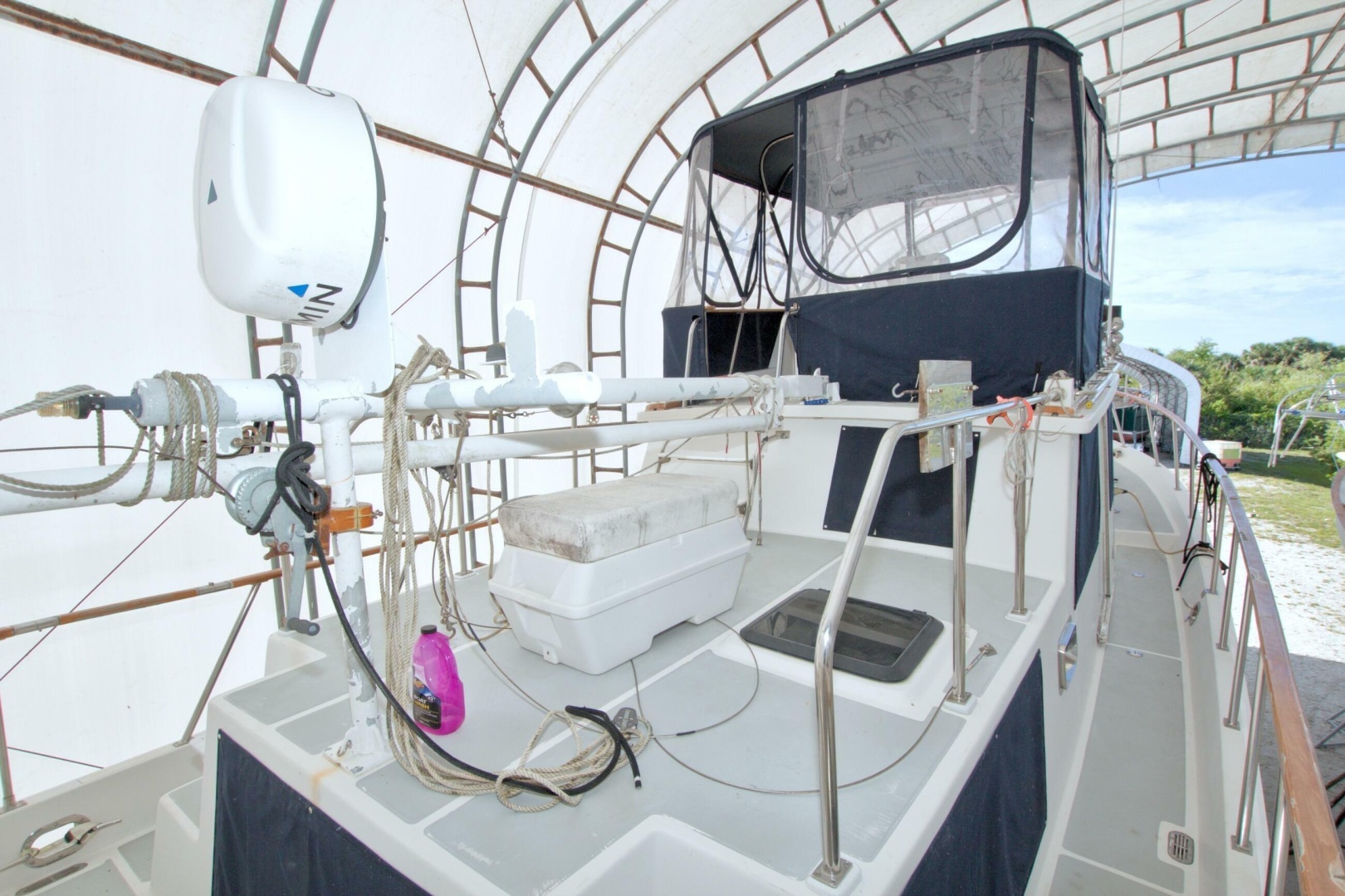 Well-equipped with Garmin electronics including radar and autopilot with wireless remote, dual helm stations, bow thruster, generator, and dual-zone air conditioning, this vessel is set up for extended cruising. No teak decks reduce maintenance, and the boat is currently stored on the hard for easy inspection.