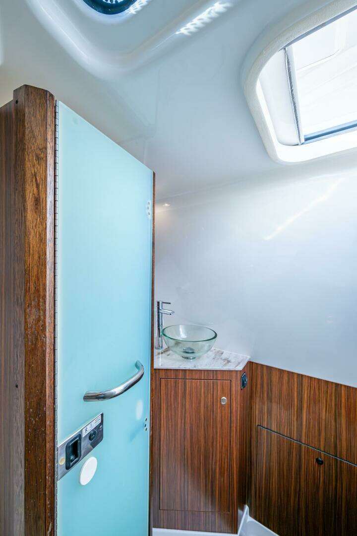 The cabin is easily accessible with a fiberglass door and features solid wood accents with modern finishes, a full berth forward and a comfortable aft berth. A small family or couple may overnight with basic amenities for the weekend. Hull side windows reveal plenty of natural light below.