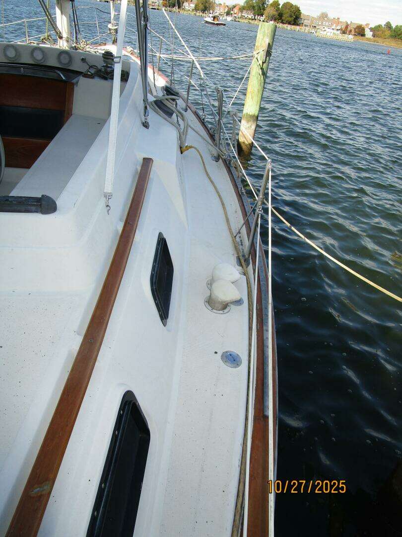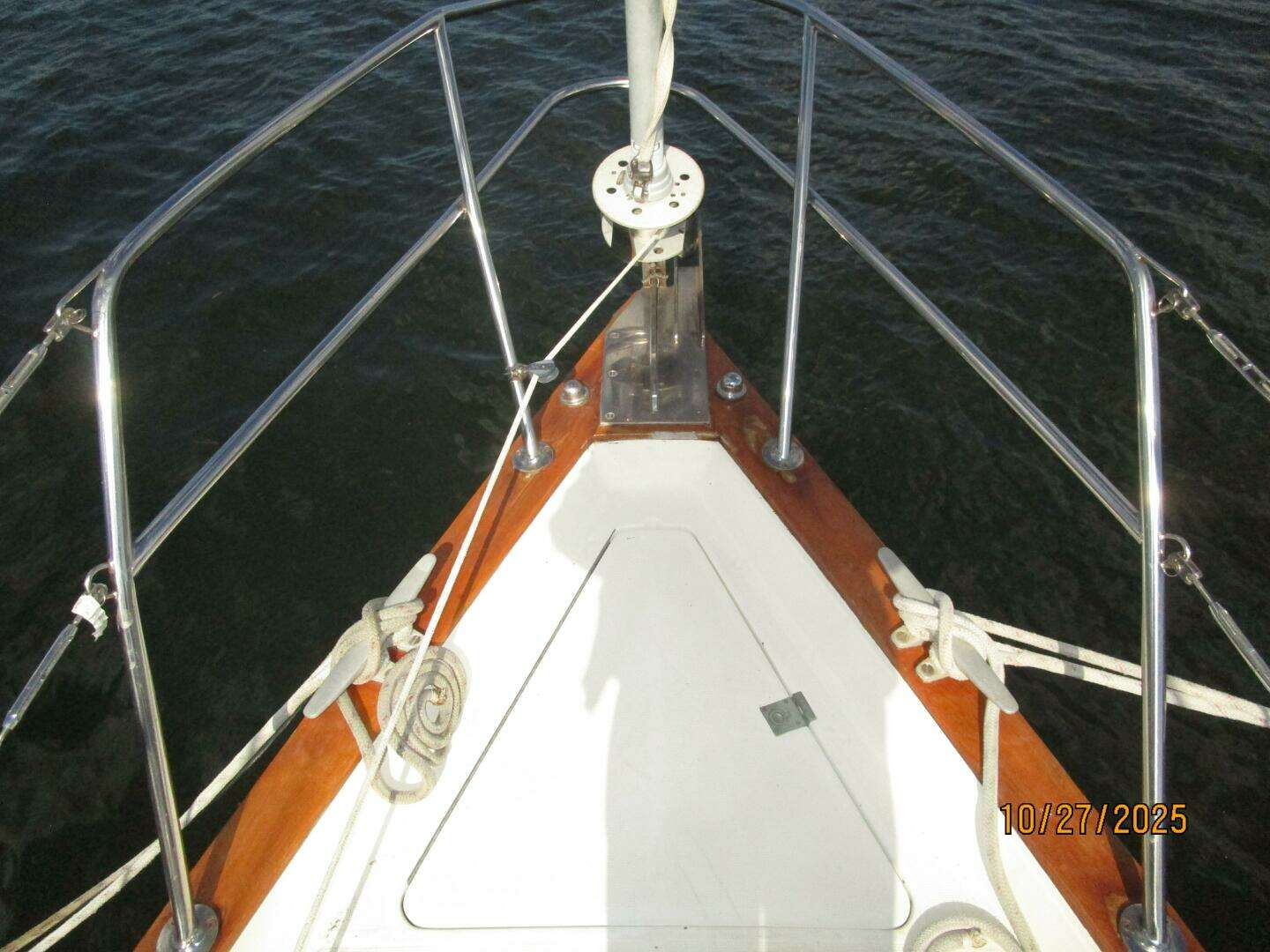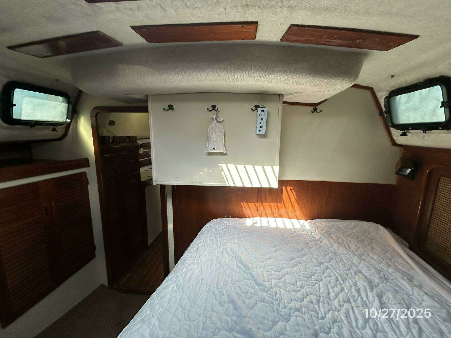 The forward stateroom offers a v-berth with an insert, overhead hatch, 2 portlights, shelves, storage cabinets and a privacy door. The head with 1/2 tub and shower is starboard aft.